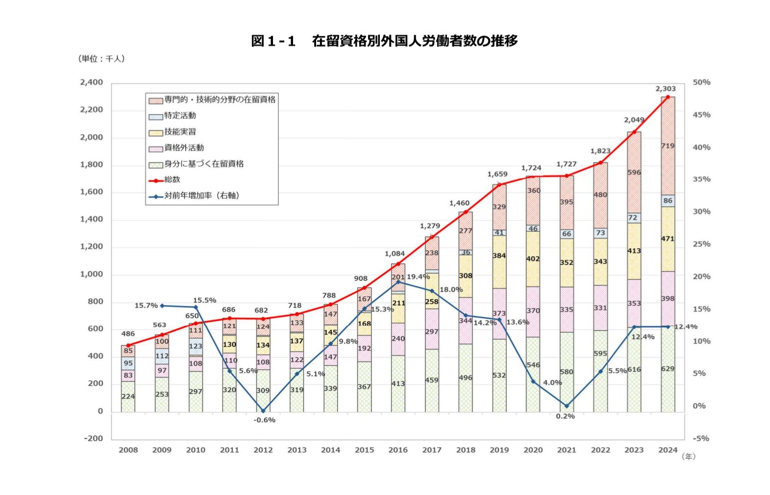 厚生労働省が発表した令和6年10月末時点の外国人雇用状況によると、外国人労働者数は2,302,587人に達し、前年比253,912人増加しました。この数字は、届出が義務化された平成19年以降、過去最多を更新しており、対前年増加率は12.4%と前年と同率となっています。
