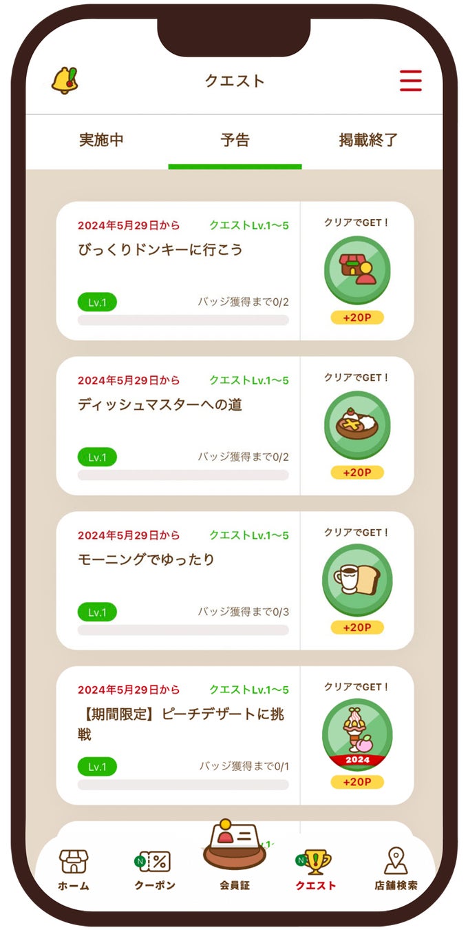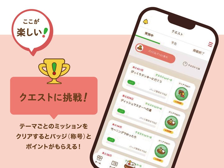 クエストは、アンケートへの回答で達成するもの、会計すると達成するもの、対象の商品を注文すると達成するものなど、さまざまなテーマがあり、各クエストをクリアするとバッジ(称号)とポイントがもらえます。