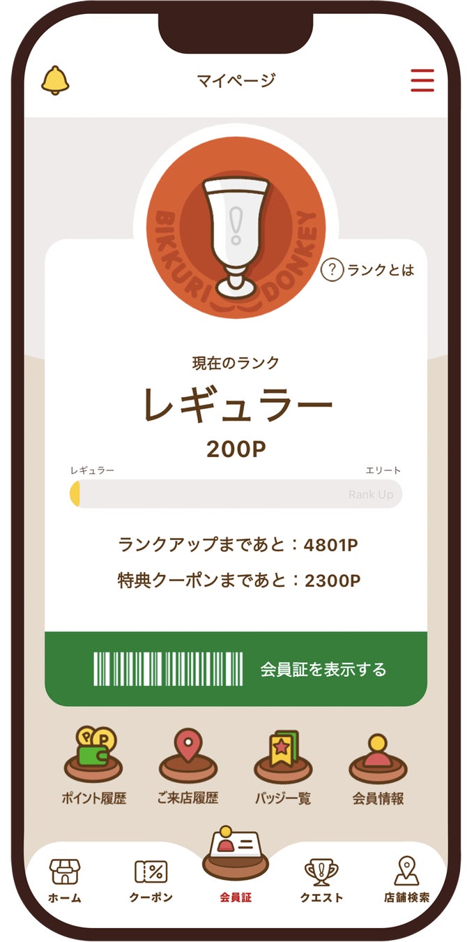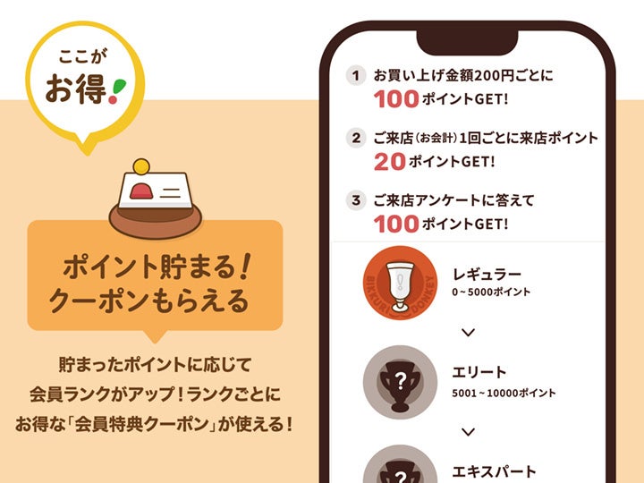 ポイントは、会計金額200円ごとに100ポイント(端数切捨て)、来店(お会計)ごとに20ポイントが付与される他、クエストやアンケート回答の報酬で貯めることができ、一定ポイントに達すると特典クーポンがゲットできます。