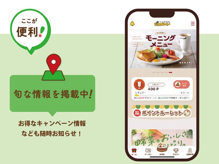 今回のリニューアルでは、クーポン配信、会員ポイント制度、期間限定商品を含むメニュー情報やお近くの店舗検索など、「びっくりドンキー」をもっとお得に、便利にご利用いただくためのコンテンツを実装し、お客様のさらなる利便性の向上に努めてまいります。