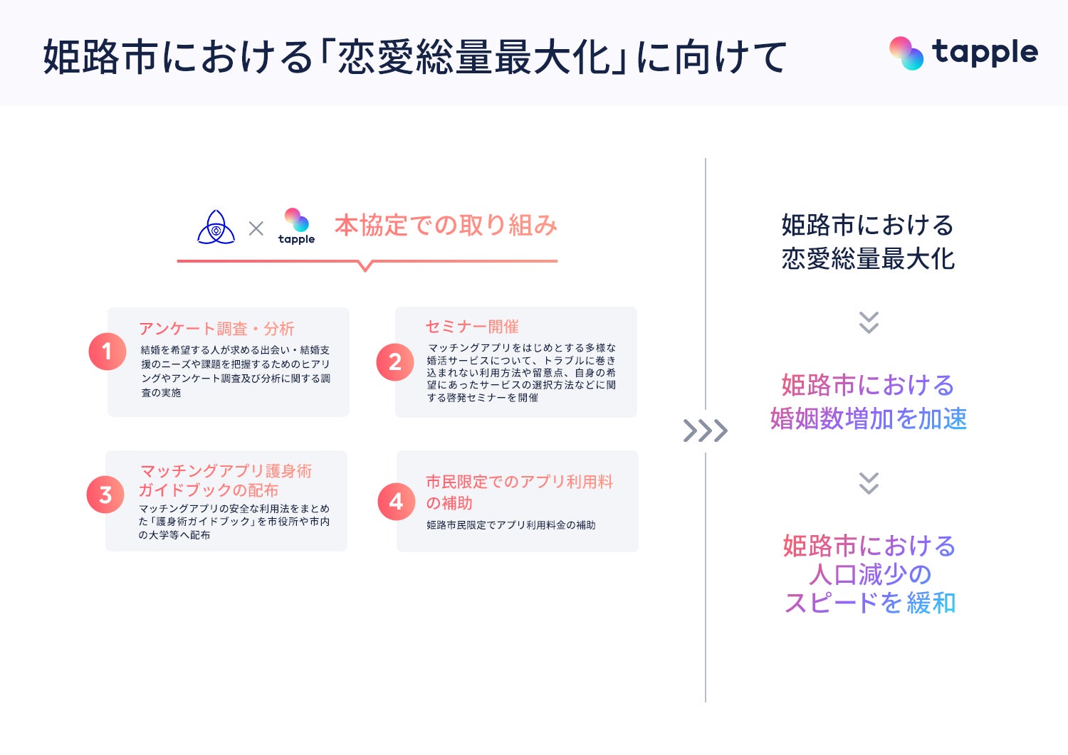 株式会社タップル(本社:東京都渋谷区、代表取締役社長:平松繁和)は運営するマッチングアプリ「タップル」において、結婚を希望する方々の多様なニーズに応じた出会い・結婚支援に取り組むことを目的に、兵庫県姫路市と「結婚支援に関する連携協定」を締結したことをお知らせいたします。