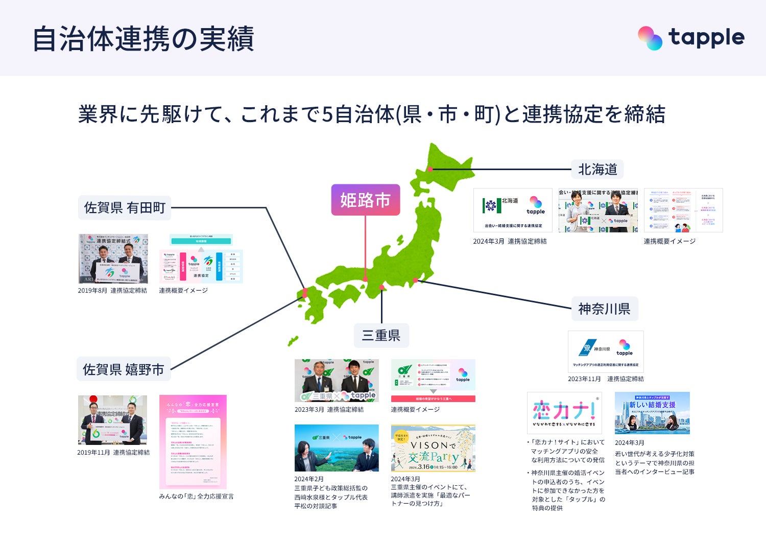 このような背景のもと、タップルでは結婚を希望する未婚者に対し結婚のきっかけづくりを支援することを目的に、これまで佐賀県有田町、佐賀県嬉野市、三重県、神奈川県、北海道の5つの自治体と連携協定を締結し、安心・安全なマッチングアプリの啓発および適正利用の促進による少子化問題の解決に向けた貢献に取り組んでまいりました。