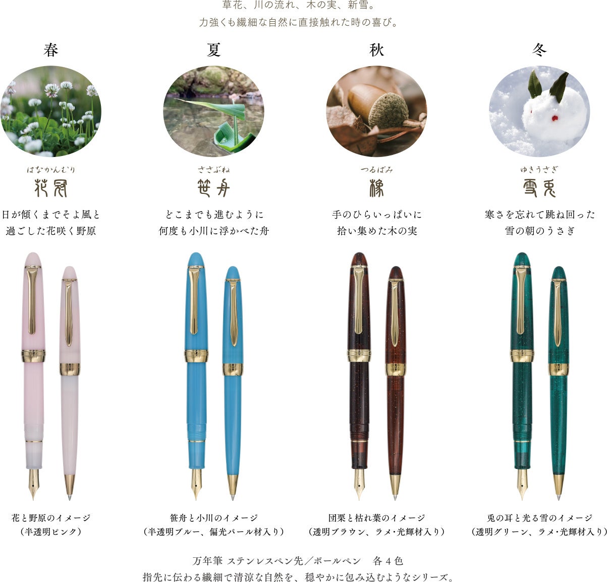 草花、川の流れ、木の実、新雪。力強くも繊細な自然に直接触れた時の喜び。季節ごとの自然と触れ合う遊びをモチーフにした透明感のある4色展開。万年筆とボールペンで絶妙に異なる透け感も特長です。