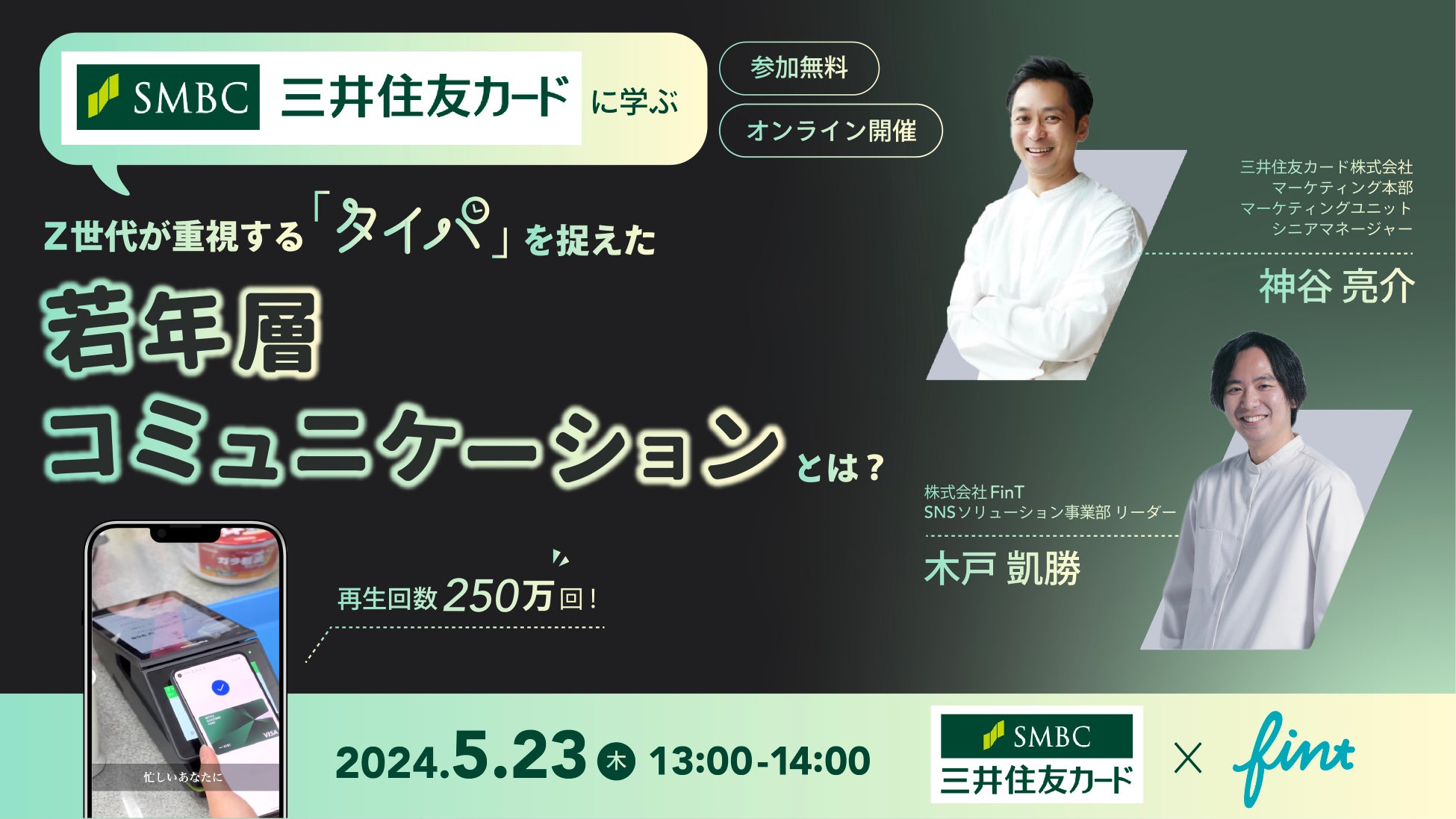 株式会社FinT(本社:東京都渋谷区、代表取締役:大槻 祐依)は5月23日(木)13:00〜14:00より、三井住友カードに学ぶ、Z世代が重視する 「タイパ」を提えた 若年層コミュニケーションとは?と題して、三井住友カード株式会社とショートドラマに関する共催ウェビナーを開催いたします。