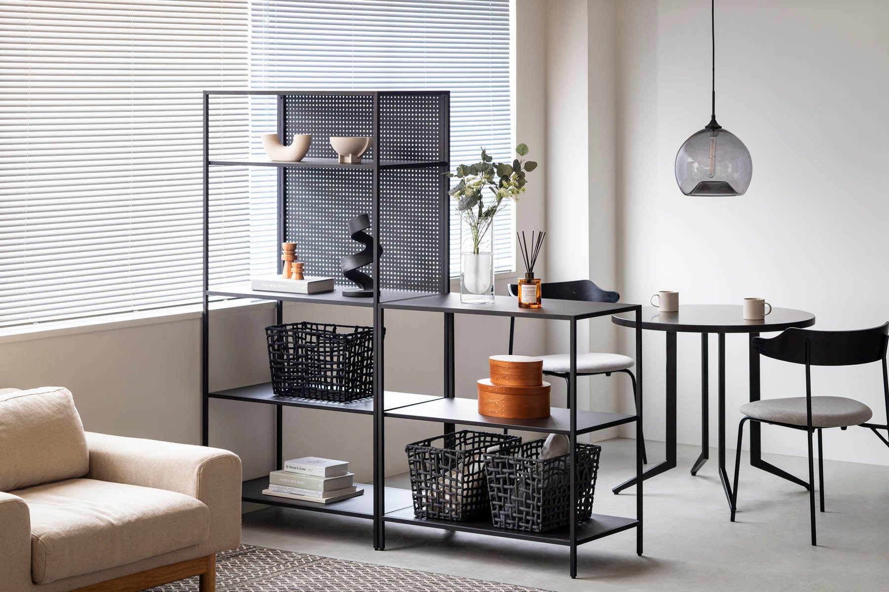 リビングとダイニングの間仕切りとして配置しても、視線や光を通すため部屋が狭く感じません。グリーンやアートを飾ることで、空間に彩りを与えます。