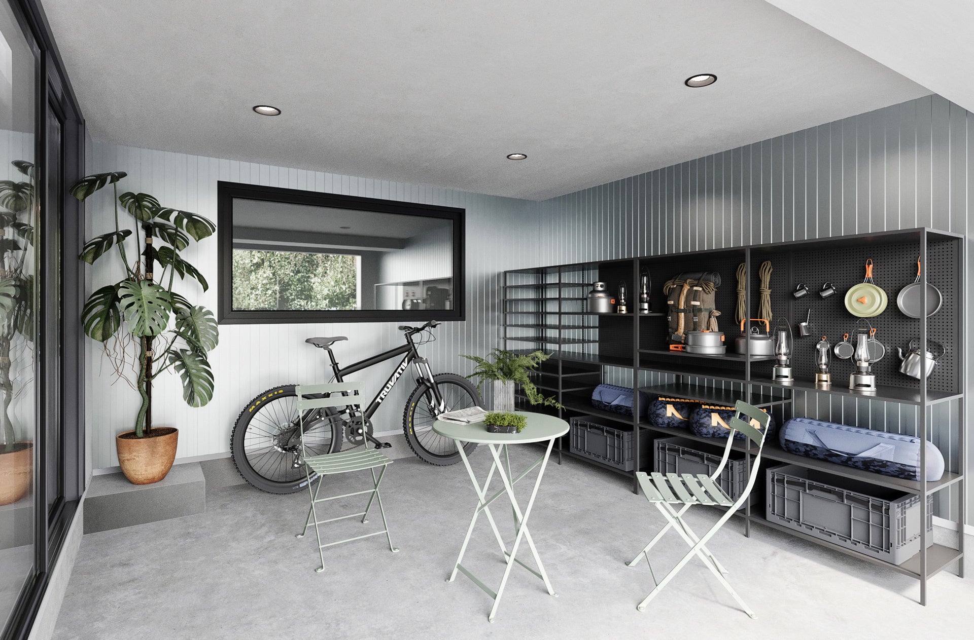 自転車やアウトドアギア、ツールボックスなど、無骨なアイテムとの相性も抜群。ガレージや土間のような空間に置くことで、まるでショップのようなディスプレイ収納を楽しめます。