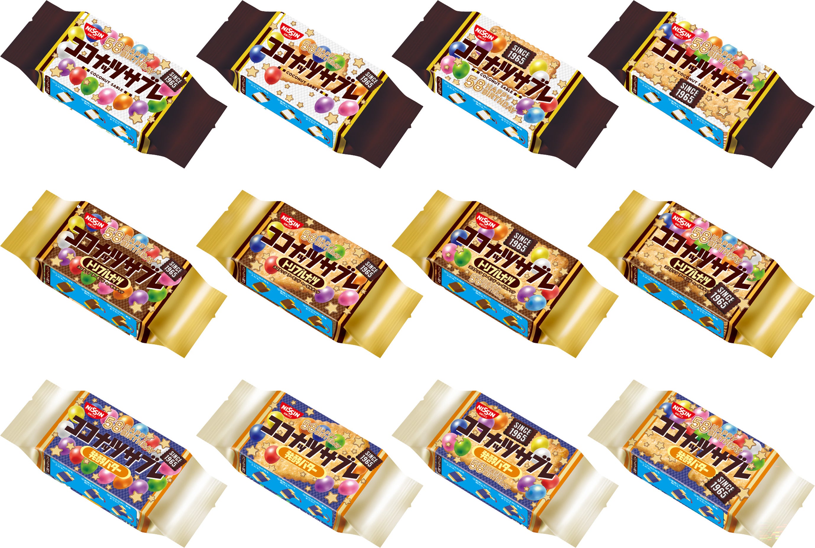今回、「ココナッツサブレ」が58回目の誕生日を迎えるのを記念して、誕生日会を楽しく演出する「バルーンアート」をイメージしたカラフルなデザインの「ココナッツサブレ 58周年誕生日パッケージ」を期間限定で発売します。「ココナッツサブレ」「トリプルナッツ」「発酵バター」とも、内袋に4種類のデザインをプリントし、ワクワク感や選べる楽しさをお届けします。