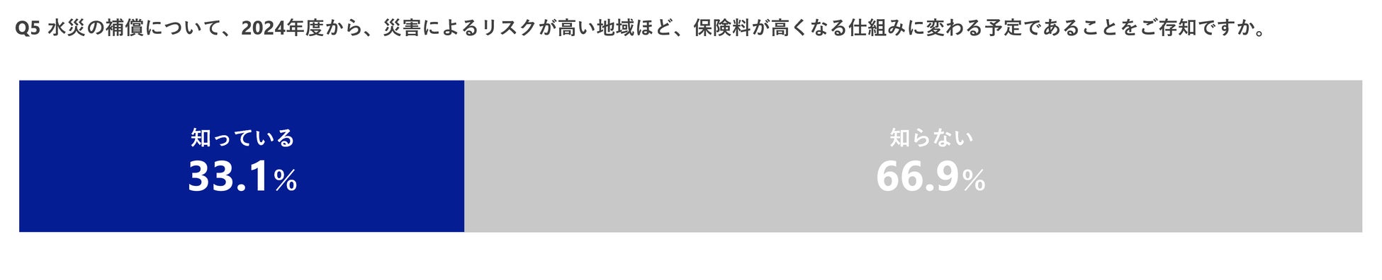 これまで全国一律であった水災料率(※4)ですが、保険の公平性を担保するために2024年度から、水災リスクの高い地域ほど保険料が高くなる仕組みに変わる予定です。そのことを「知っている」と答えた方は33.1%、「知らない」と答えた方は66.9%となりました。