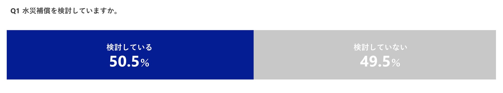 1.水災補償を「検討している」と答えた方が50.5%、「検討していない」と答えた方は49.5%。