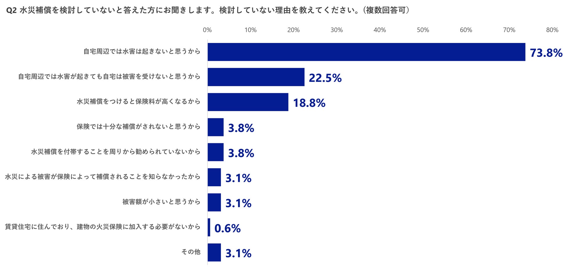 2.水災補償を検討していない理由は「自宅周辺では水害は起きないと思うから」が最も多く73.8%。