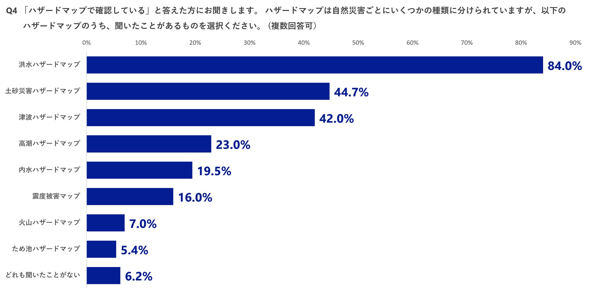 4.公開されているハザードマップのうち、知名度が最も高いのは「洪水ハザードマップ」で84.0%。