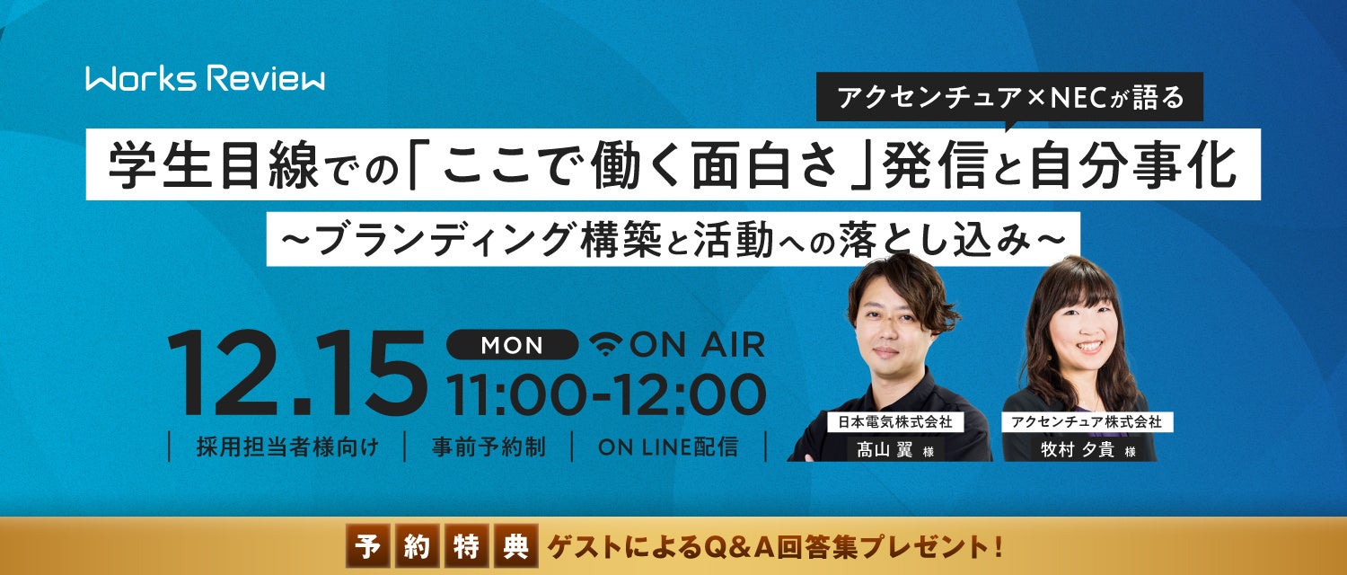 株式会社ワークス・ジャパン(本社:東京都千代田区、代表取締役:清水信一郎)は、2025年12月15日(月)に企業の人事担当者及び人材開発担当者を対象にしたオンラインフォーラム、WORKS REVIEW『アクセンチュア×NECが語る 学生目線での「ここで働く面白さ」発信と自分事化~ブランディング構築と活動への落とし込み~』を開催します。