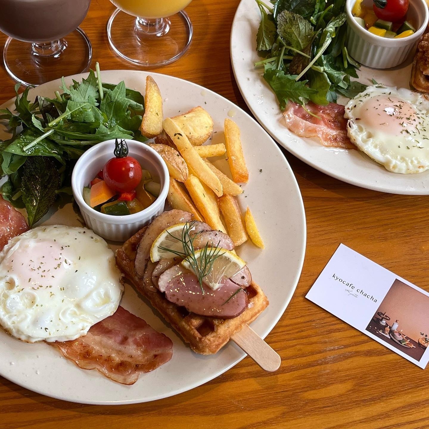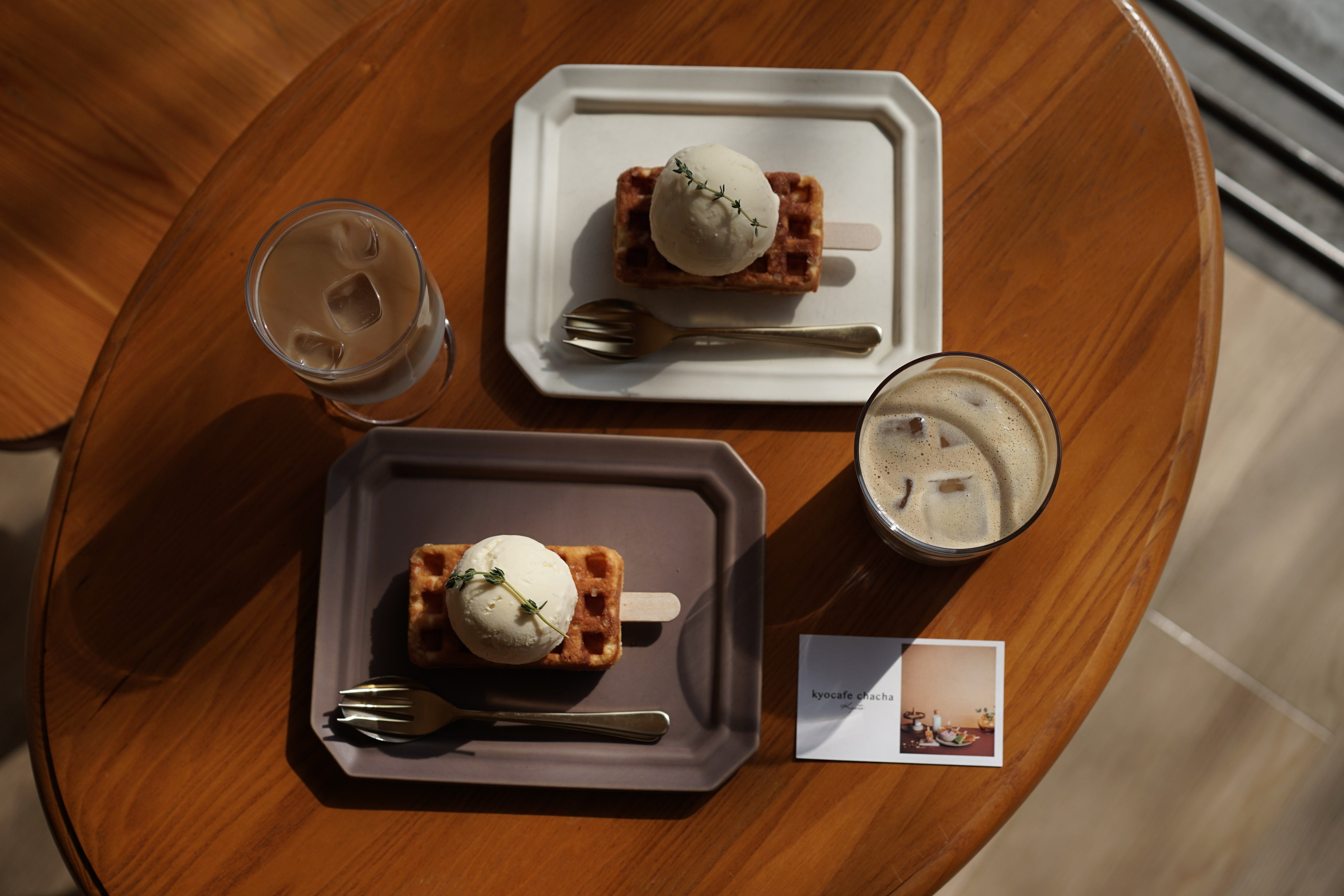 店内では、ここでしか食べられない、kyocafe chachaオリジナルの〈モーニングプレート〉や、カフェタイムには京ワッフルと季節の素材等を使った〈こだわりのスイーツプレート〉をお楽しみいただけます。