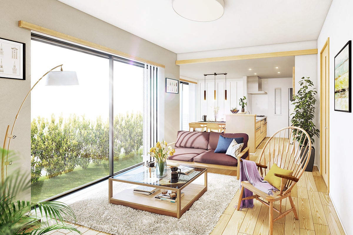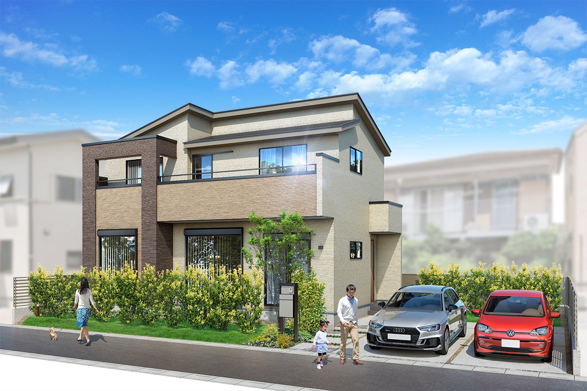 草加市の地区計画により、最低敷地面積が130m2に定められている、ゆとりある住環境。将来的にも良好な環境が保たれる「第一種低層住居専用地域」内に、開放感と陽光に包まれる住まいが誕生します。