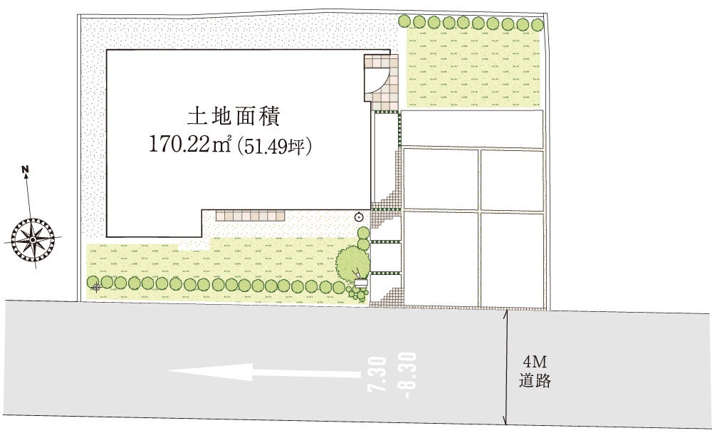 並列2台カースペースは車の出し入れがしやすく、買い物や子どもの送迎、ゲスト用など多彩な場面で活躍します。また、毎日の買い物や通勤・通学に便利なサイクルスペースや、テーブルや椅子を置いてテラス空間を実現できる広々とした芝生庭を設けました。南道路に接道することで、より開放感を持たせました。