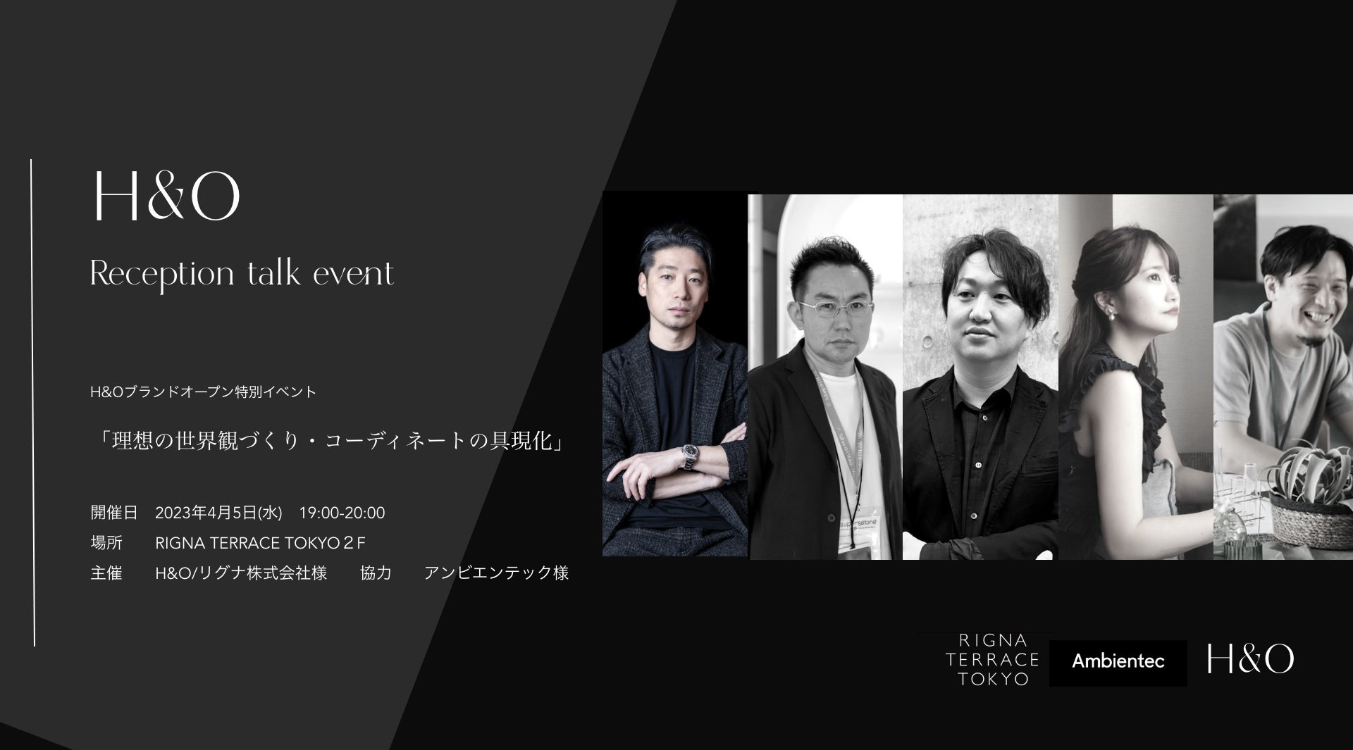 期間限定ストアのオープンを記念し、商品の新作発表会と共に「理想の世界観つくり・コーディネートの具現化」をテーマにトークイベントを開催します。「H&O」のブランドデザインサポートを担当している谷尻誠氏、「H&O」制作会社株式会社マイセット製作所高橋大氏、期間限定ストア協力会社のアンビエンテック久野義憲氏、ブランドディレクターの川原あやか氏、リグナのコーディネーター村野友明が登壇いたします。