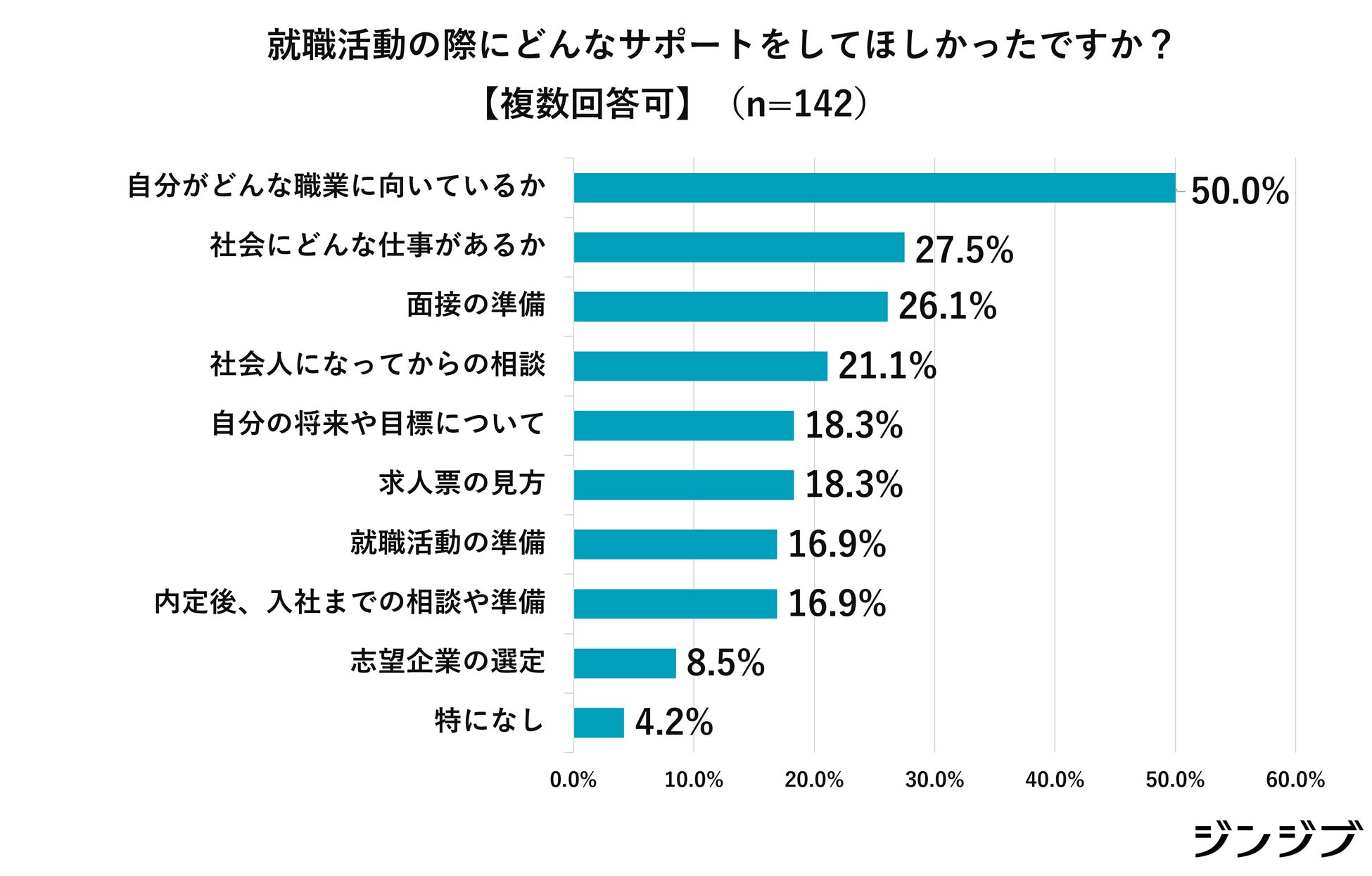 2023年に入社した高卒の社会人1年目に「就職活動の際にどんなサポートが欲しかったか」尋ねたところ、半数が「自分がどんな職業に向いているか」と答えました。