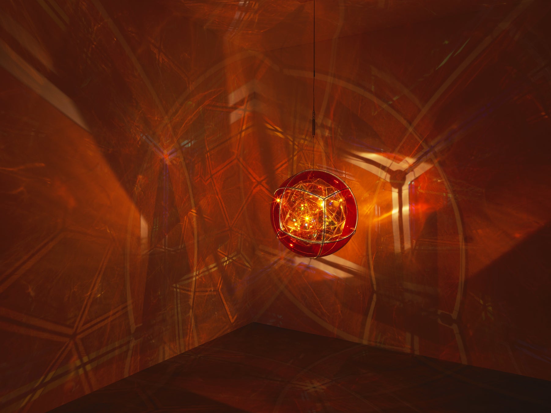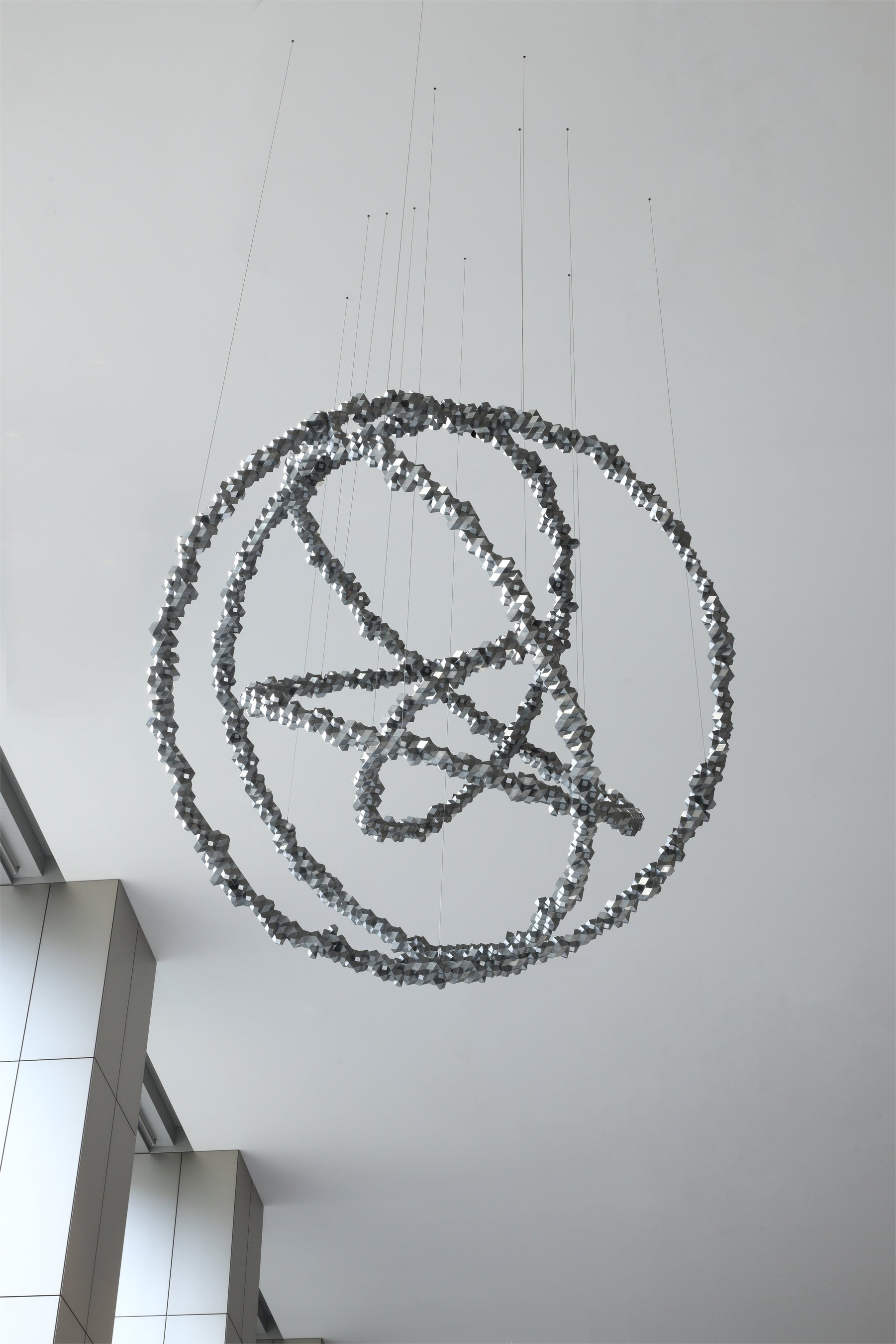 本作は、天井高約15mの吹き抜け空間に連続的に吊るされた、直径約3mにおよぶ 4つの彫刻により構成されており、スタジオ・オラファー・エリアソンが長年続けてきた幾何学的形体の研究や地質学的な時間に対する概念的な問いに基づき、初めて再生金属が使われました。