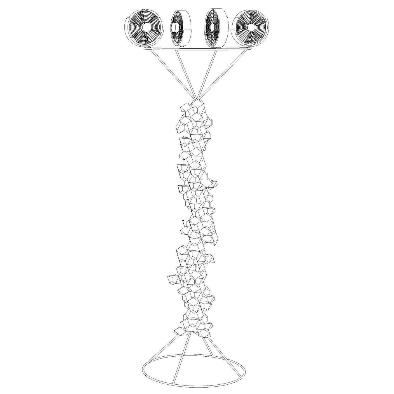 彫刻の形状は、ひとつの点がねじれながら移動する軌跡を描いたもので、人々の行動、求心力、自由に動くダンスなど、あらゆるものの運動を表現するかのようでもあります。徐々に複雑になるこれらの形は、振動を表すリサジュー曲線に着想を得て、そこからダイナミックな立体に転換されました。細部に目を向けると、菱形、凧型、三角形で構成される十一面体を多数繋ぎ合わせることで全体が形作られていることがわかります。
