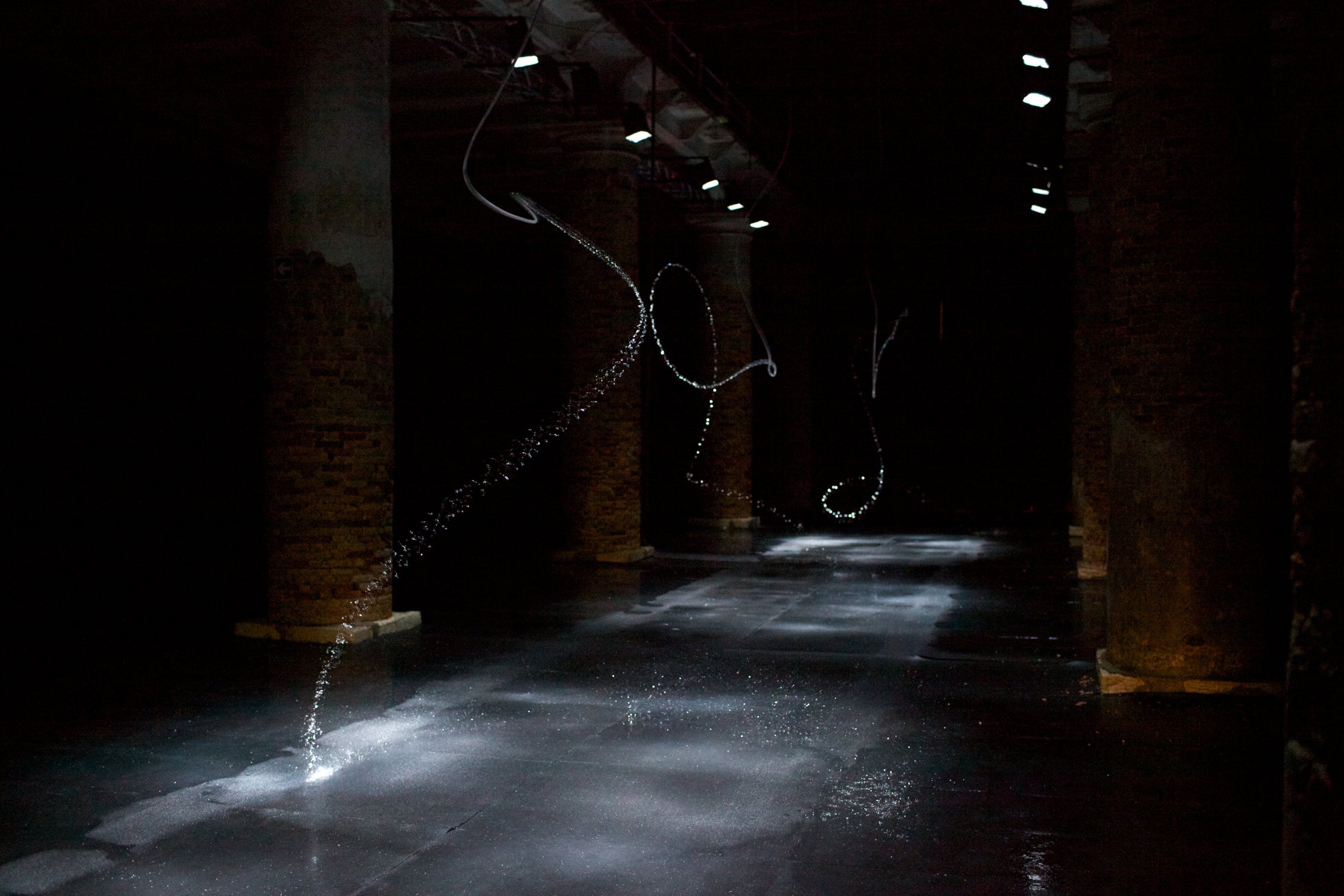 天井高5m、全長20mを超える暗闇の空間にストロボの光で瞬間的に照らされ展示される本作は、2010年に発表された作品を本展に合わせ再構成したものです。水と光というシンプルな要素によった無限に生み出される水の曲線の抽象表現は、エリアソンが長年取り組んでいる幾何学形体の研究や自然素材に内在する美しさへの理解をうながします。