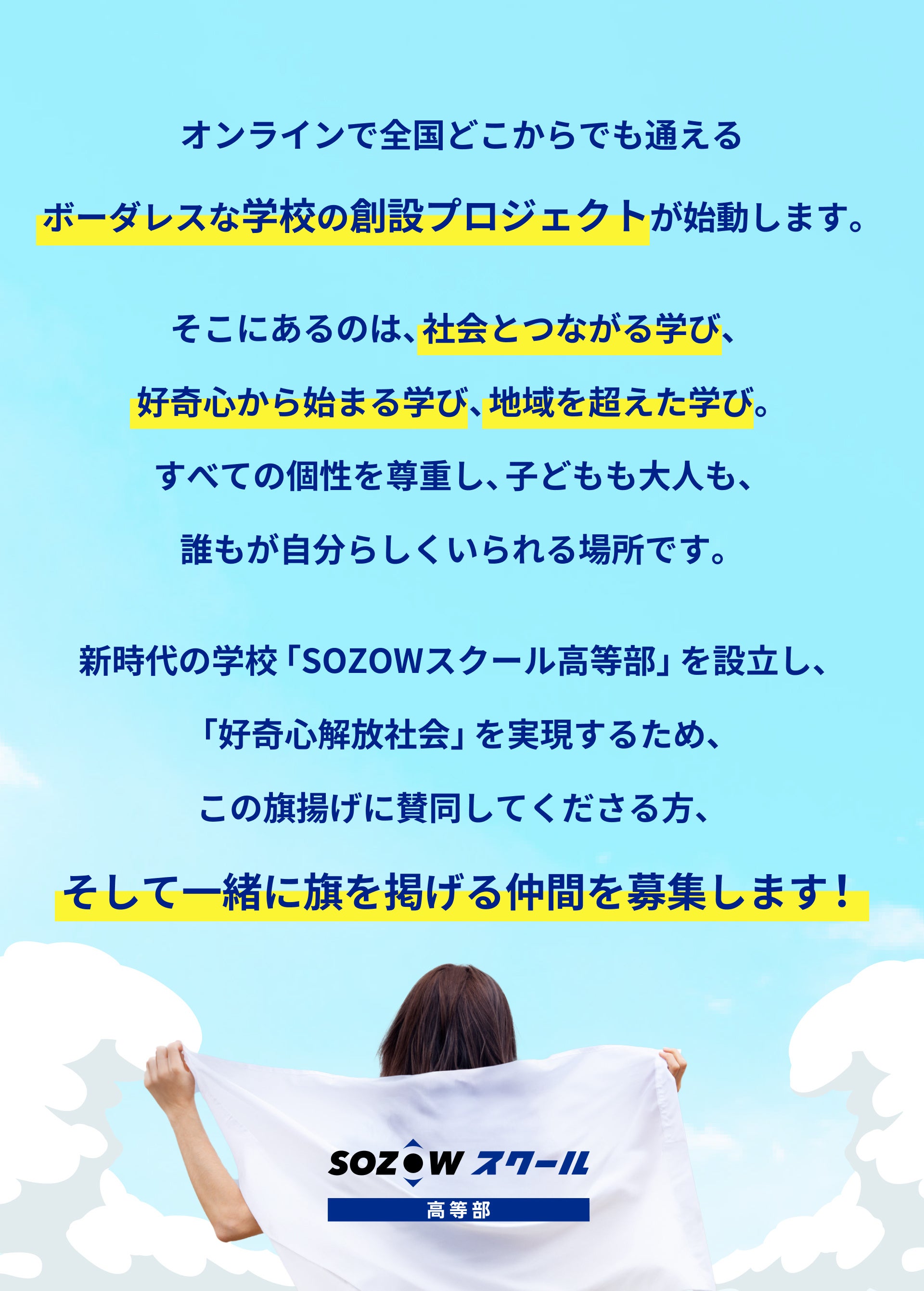 「SOZOWスクール高等部」創設プロジェクトを成功させ、共に「好奇心解放社会」を実現しましょう。
