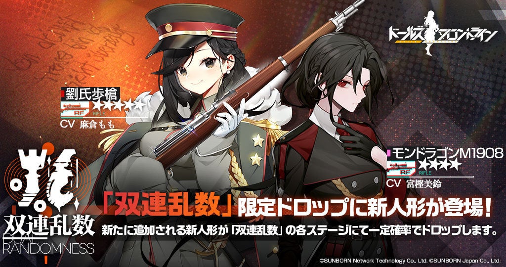 「双連乱数」の特定ステージにて、新らしい★5RF「劉氏歩槍(CV:麻倉もも)」、★4RF「モンドラゴンM1908(CV:富樫美鈴)」に加え、過去の限定人形が一定確率でドロップします。