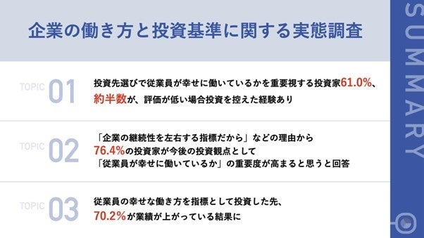 - 投資先として「従業員が幸せに働いているか」を重要視する投資家61.0%