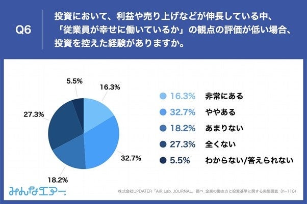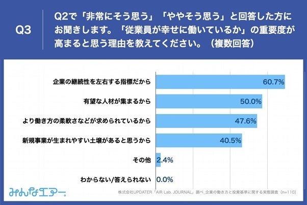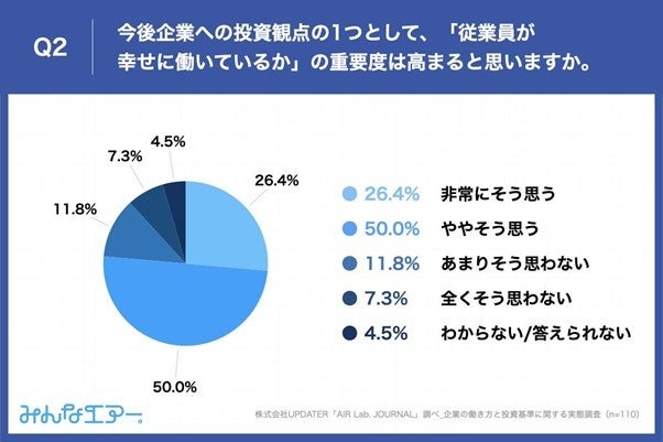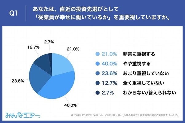 「顔の見えるライフスタイル」の実現を目指す株式会社UPDATER(所在地:東京都世田谷区、代表取締役:大石英司)のWell-being tech事業「みんなエアー」(https://minnaair.com/)は、2022年8月30日(火)に開催する『みんなの働き方EXPO』でのセッションテーマの一つである「幸せな働き方の企業に資本が集まる理由(https://minnaair.com/blog/week2022-expo/#session4)」に関する緊急調査として、株式投資家110名を対象に、企業の働き方と投資基準に関する実態調査を実施しました。