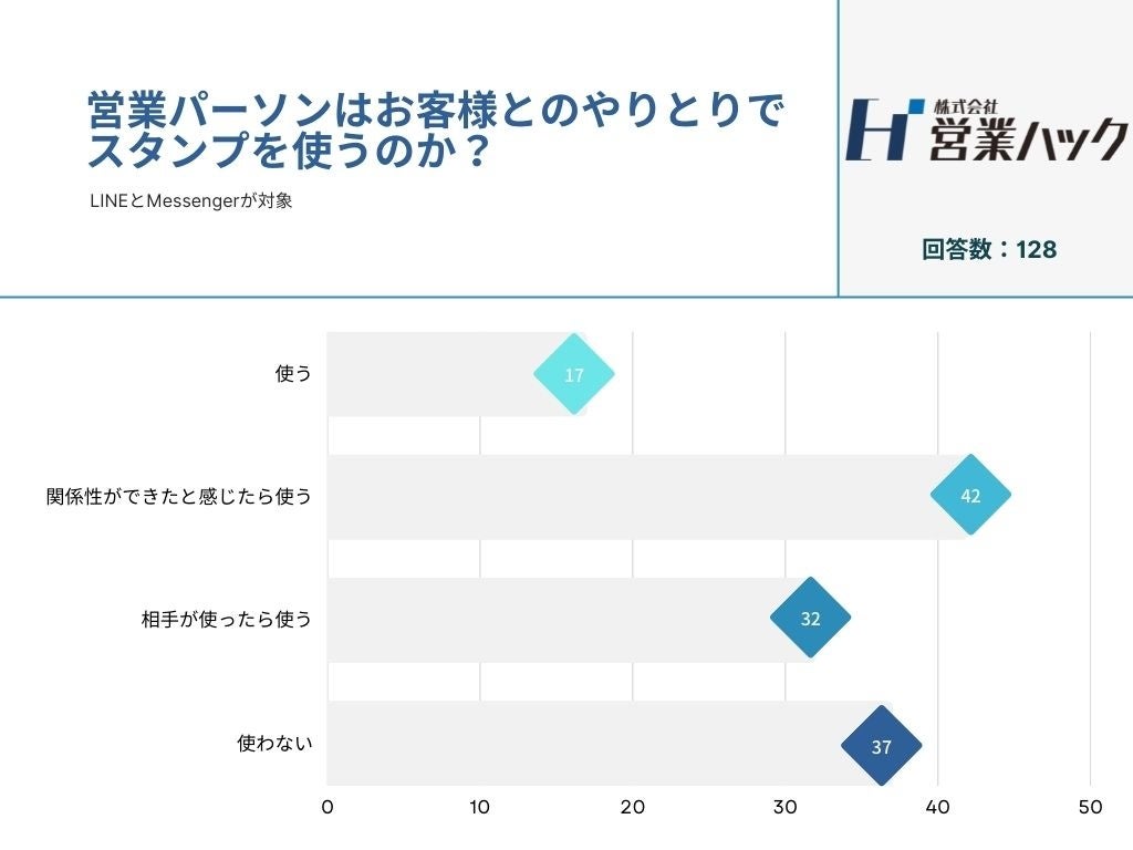 株式会社営業ハック(本社:東京都港区・代表:笹田裕嗣)は、営業パーソンのお客様とのやりとり方法について調査を実施いたしました。約200名の営業パーソンに「お客様とのやりとりでLINEスタンプを使うか?」とアンケートを取り、その結果をここにご報告させていただきます。また回答内容から、ビジネスにおけるコミュニケーションの正解とは何かを考察しました。