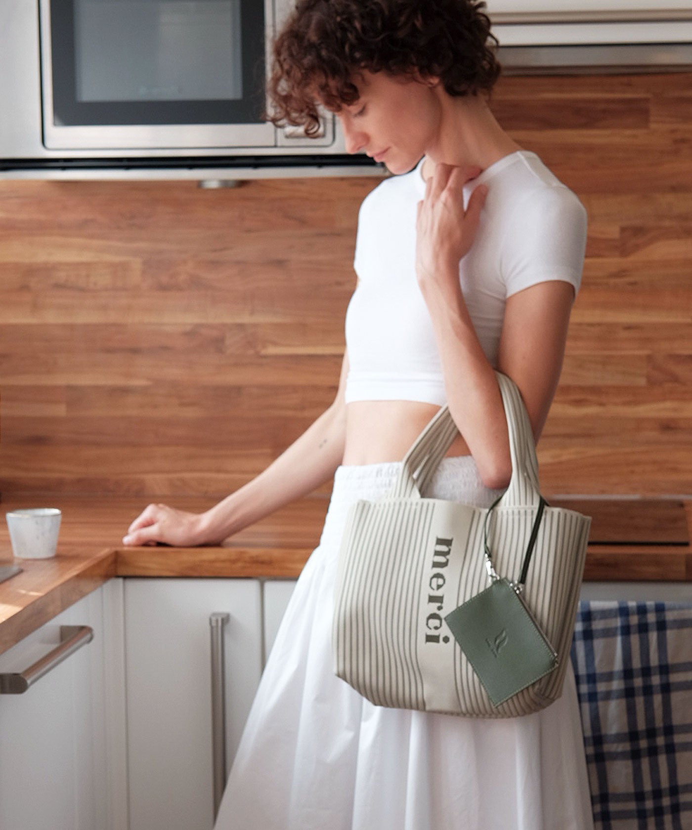 コンパクトなルックながら、「merci(メルシー/ありがとう)」のプリントが目を惹きます。
