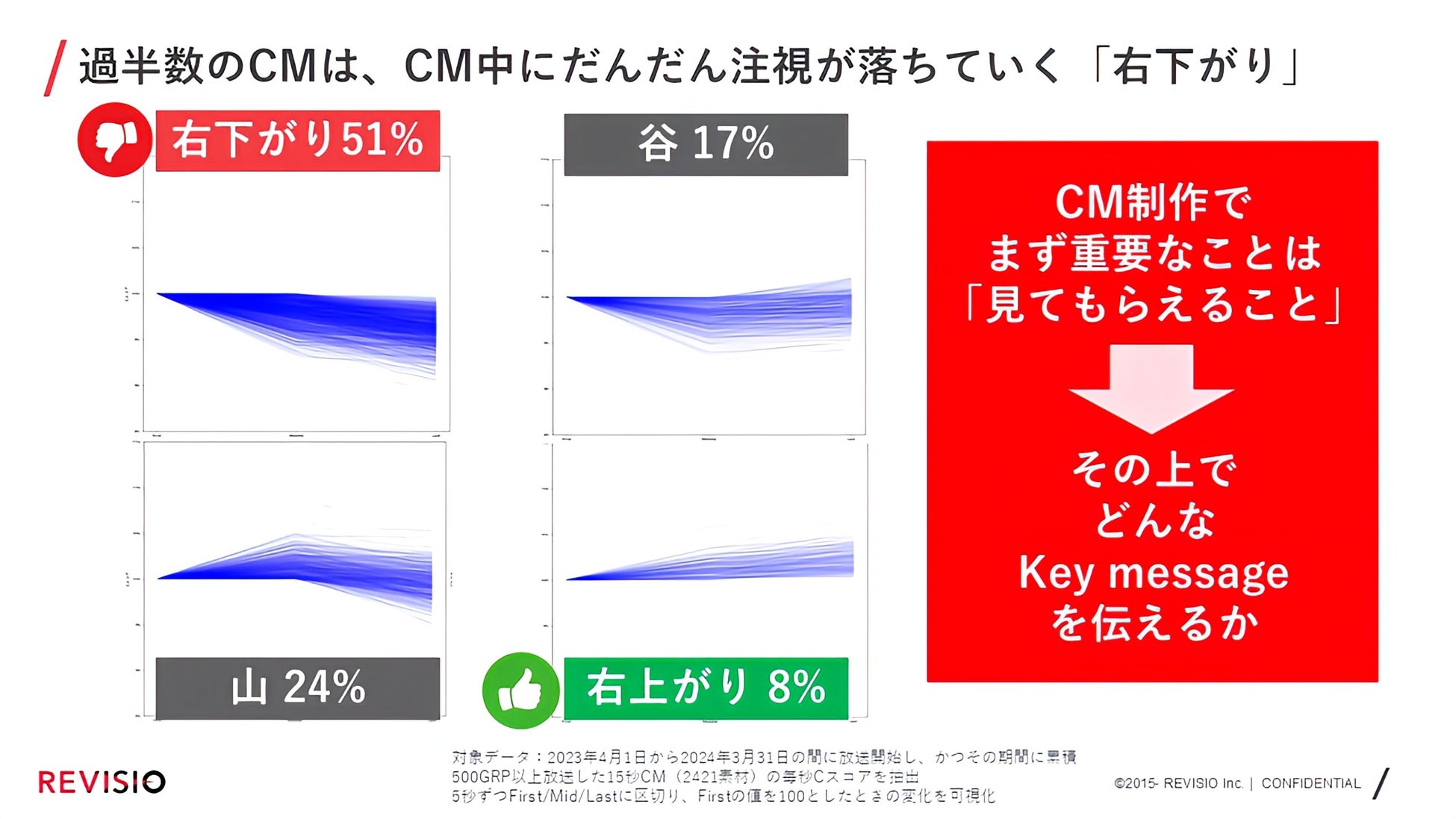 REVISOでは、8.6万本以上のCMのアテンションデータを蓄積しているため、「CMの視られる要素」と「視聴者に視られるためのCMづくり」のノウハウを持っています。