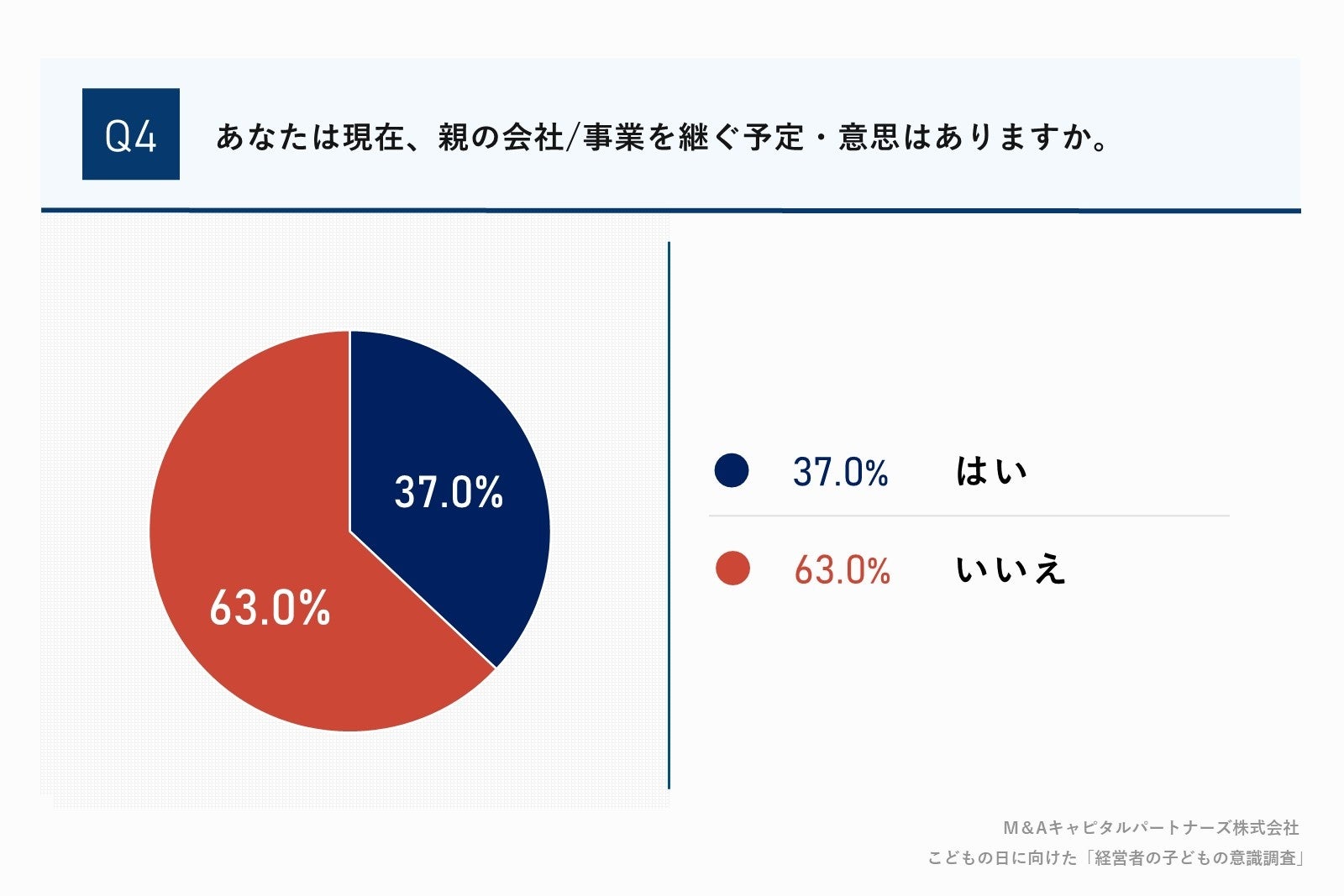 「Q4.あなたは現在、親の会社/事業を継ぐ予定・意思はありますか。」(n=108)と質問したところ、「はい」が37.0%、「いいえ」が63.0%という回答となりました。