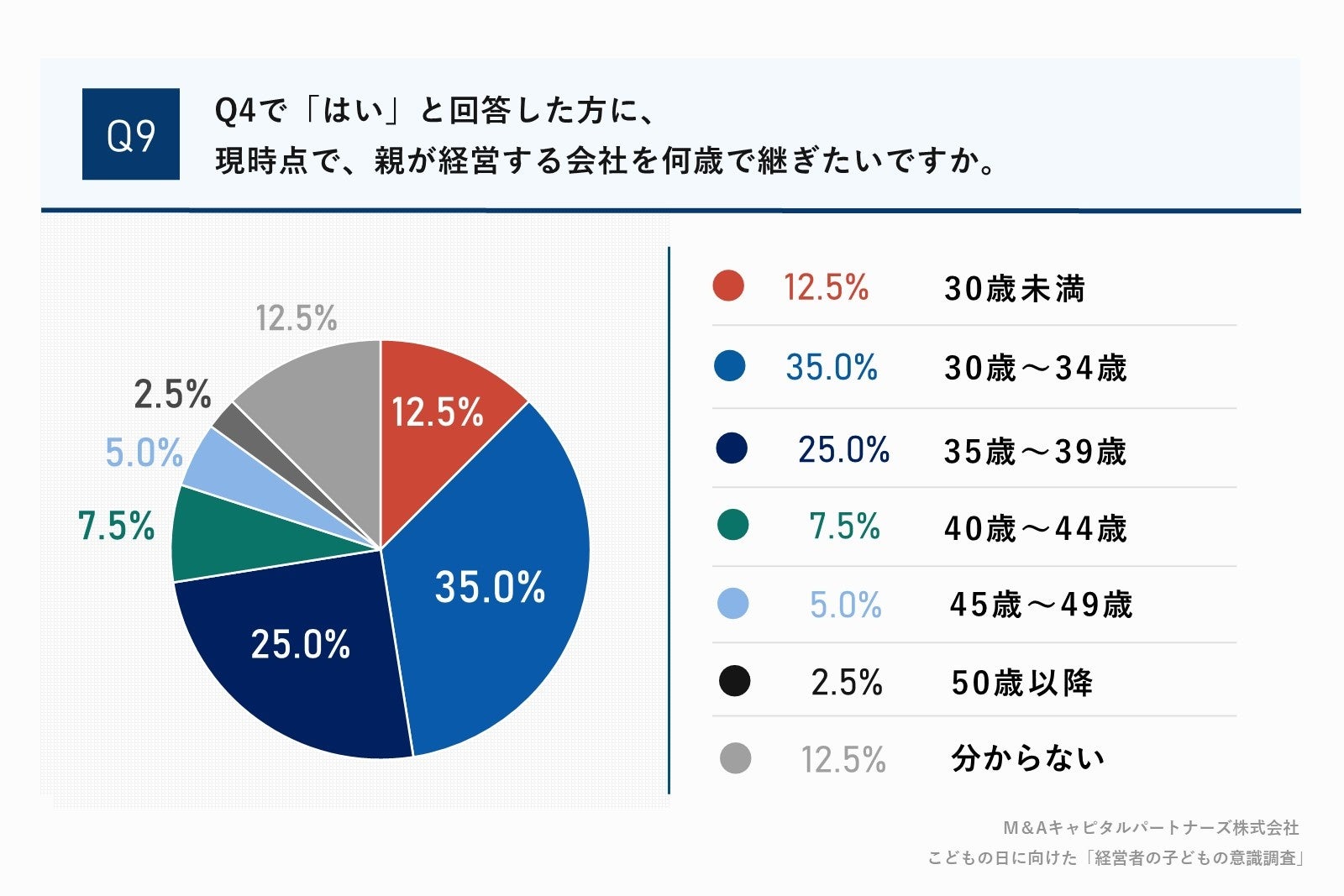 Q4で「はい」と回答した方に、「Q9.現時点で、親が経営する会社を何歳で継ぎたいですか。」(n=40)と質問したところ、「30歳~34歳」が35.0%、「35歳~39歳」が25.0%という回答となりました。