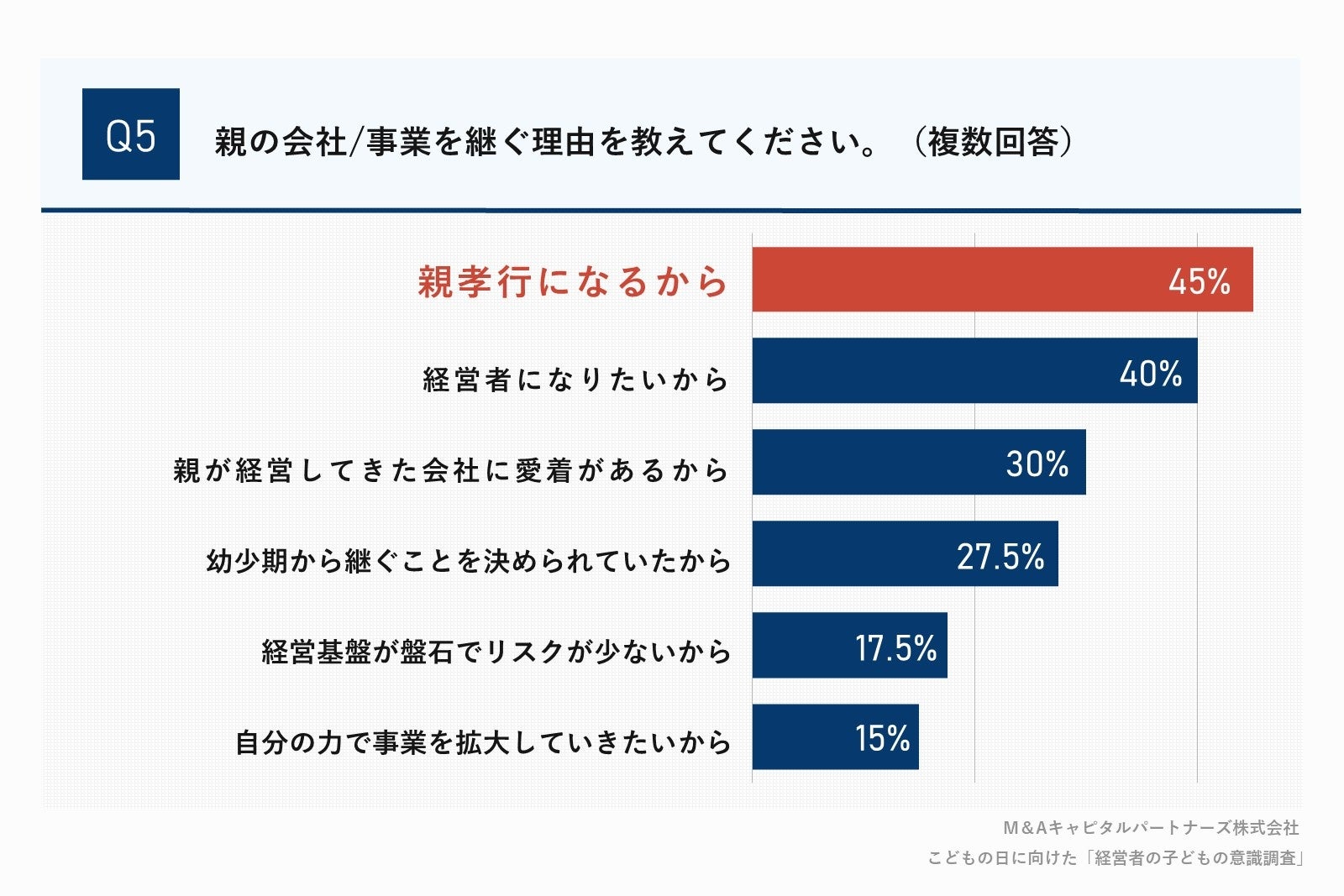Q4で「はい」と回答した方に、「Q5.親の会社/事業を継ぐ理由を教えてください。(複数回答)」(n=40)と質問したところ、「親孝行になるから」が45.0%、「経営者になりたいから」が40.0%、「親が経営してきた会社に愛着があるから」が30.0%という回答となりました。