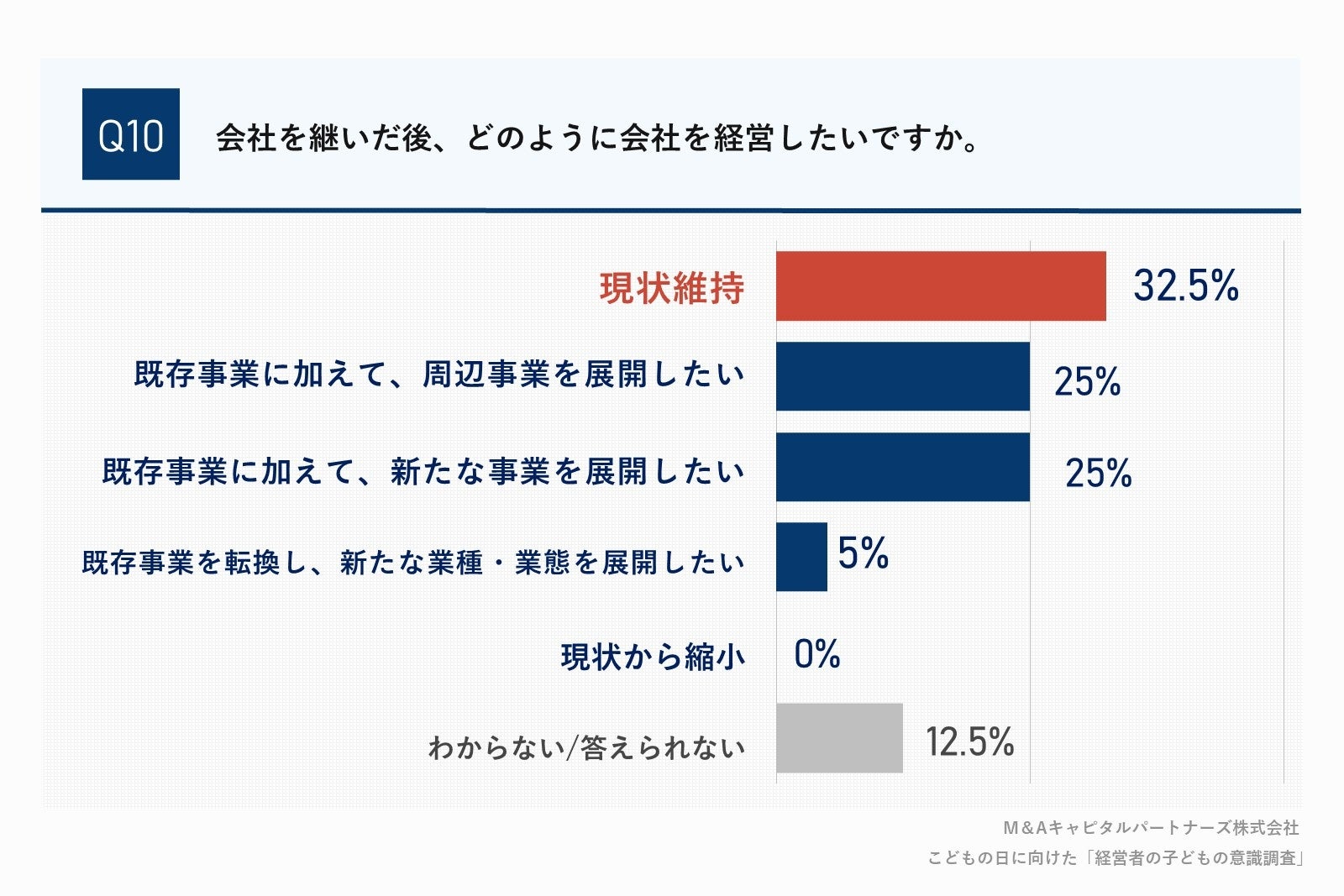 Q4で「はい」と回答した方に、「Q10.会社を継いだ後、どのように会社を経営したいですか。」(n=40)と質問したところ、「現状維持」が32.5%、「既存事業に加えて、周辺事業を展開したい」が25.0%、「既存事業に加えて、新たな事業を展開したい」が25.0%という回答となりました。