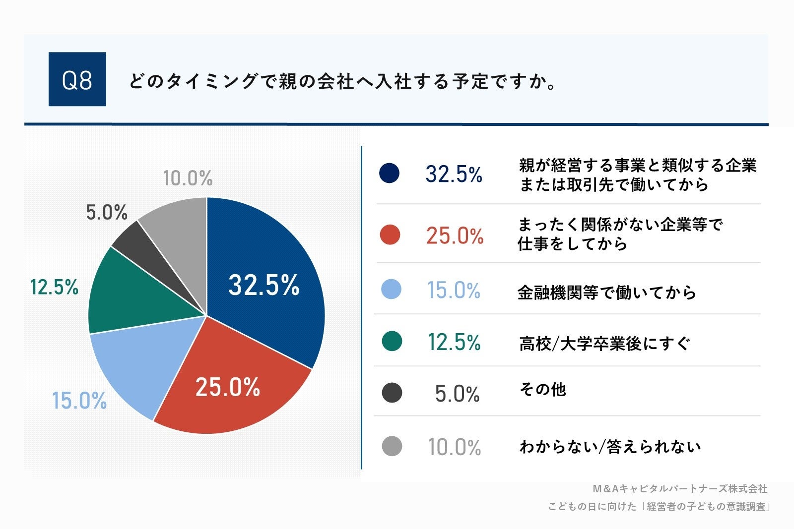 Q4で「はい」と回答した方に、「Q8.どのタイミングで親の会社へ入社する予定ですか。」(n=40)と質問したところ、「親が経営する事業と類似する企業または取引先で働いてから」が32.5%、「まったく関係がない企業等で仕事をしてから」が25.0%という回答となりました。