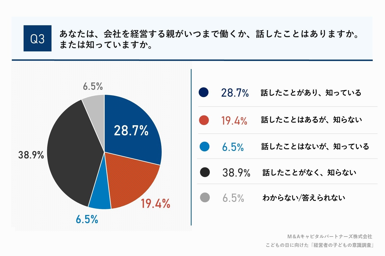 「Q3.あなたは、会社を経営する親がいつまで働くか、話したことはありますか。または知っていますか。」(n=108)と質問したところ、「話したことはないが、知っている」が6.5%、「話したことがなく、知らない」が38.9%という回答となりました。
