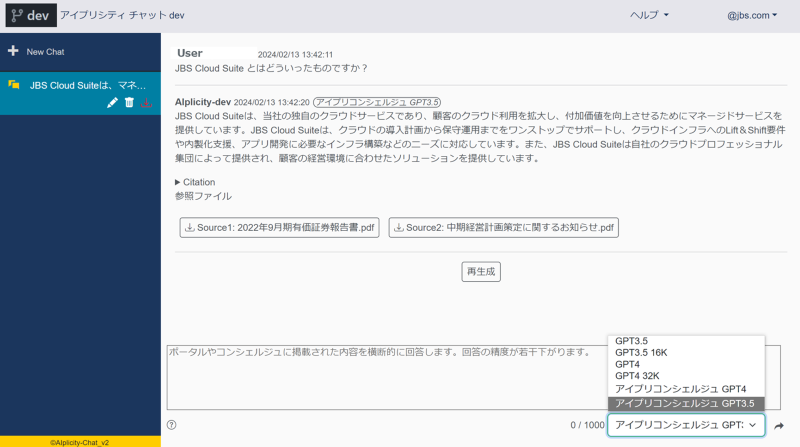 本サービスは、2023年4月に JBS がリリースした、機密情報の漏洩リスクを回避して安心安全に AI チャットを利用できるサービス「アイプリシティ チャット Powered by ChatGPT(以下、アイプリシティ チャット)URL : https://www.jbs.co.jp/solution/category/generativeai」のオプションサービスとなり、ブラウザベースのアイプリシティ チャットを介してプロンプト入力から回答生成までを行います。
