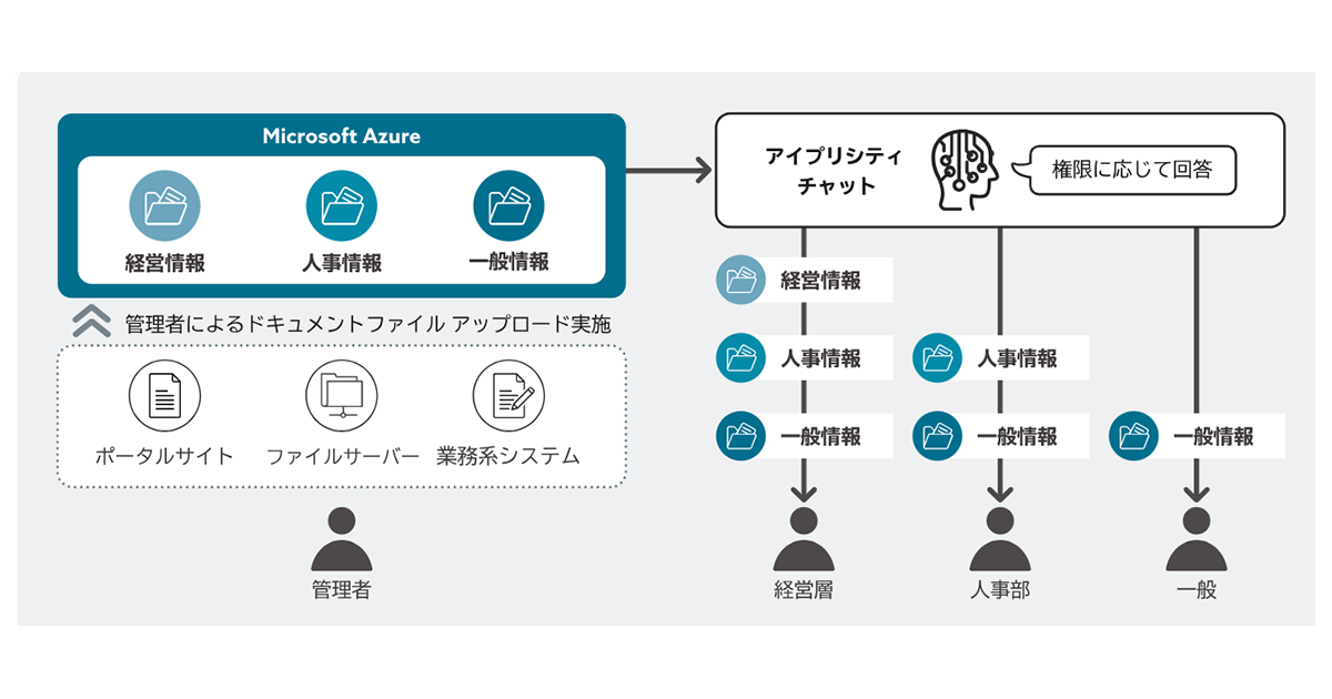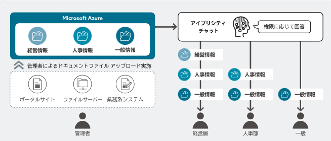 ドキュメントファイルの保存先はファイルサーバーのようにフォルダの階層構造をとることができ、適切なアクセス管理を行うことで、ドキュメントファイルの閲覧権限がないユーザーには回答を返さないよう制御することができます。また「アイプリシティ チャット」同様、お客さまのデータはお客さまが契約する「Microsoft Azure」のテナント内に保存されるため、「Microsoft Entra ID」(旧 Azure Active Directory)の認証・認可機能を用いたユーザー管理を実現します。安心して企業の大切な社内データを活用していただくことが可能です。