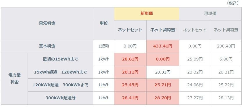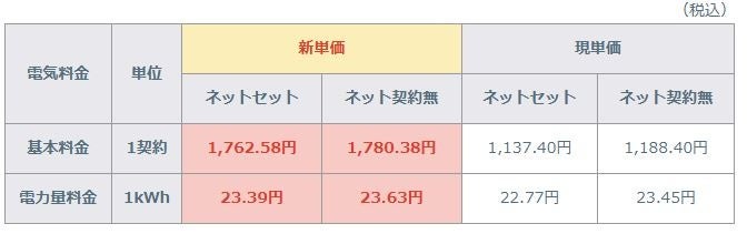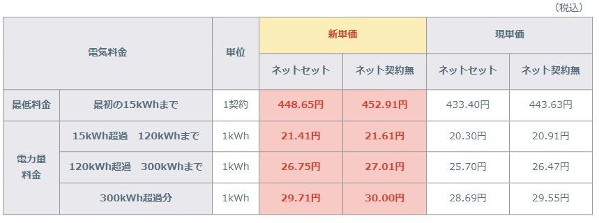 eo電気料金 新旧料金単価比較