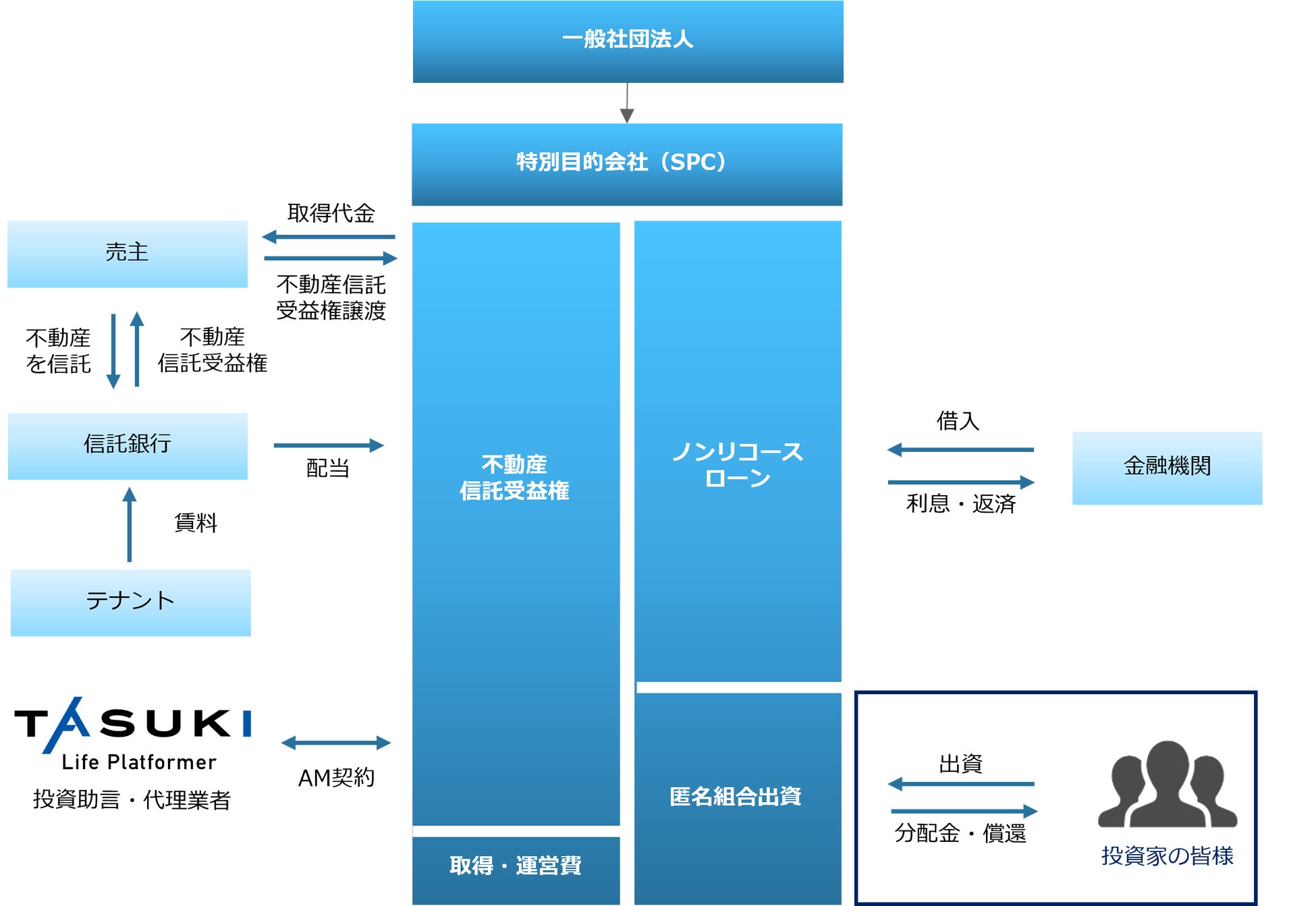 本ファンドは、投資家・当社・タスキが匿名組合出資を行い、オフバランスのSPC(Special Purpose Company/特別目的会社)が新築レジデンスの不動産信託受益権を取得・運営するスキームです。タスキは、金融商品取引法に基づく投資助言・代理業の立場から、アセットマネジメント業務を受託し、当該SPCに対して助言を行います。これによって、タスキはスリムなバランスシートを維持しながらマネジメントフィーを得るとともに、万が一の財務悪化リスクに備えて倒産隔離によりSPCへの影響を最小限に抑制可能な体制をとることで、幅広い投資家層の参入を図っております。