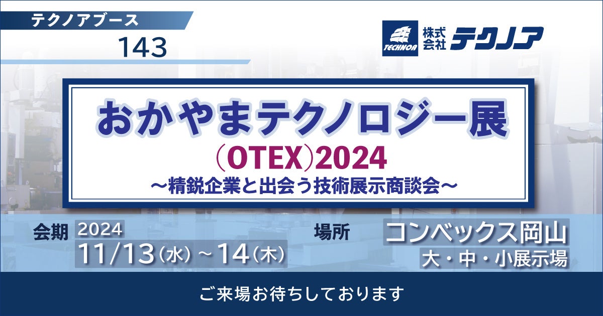 株式会社テクノア(本社:岐阜県岐阜市、代表取締役:山﨑 耕治)は、11/13~14 にコンベックス岡山 で開催される「『おかやまテクノロジー展(OTEX)2024』~精鋭企業と出会う技術展示商談会~」に出展いたします。