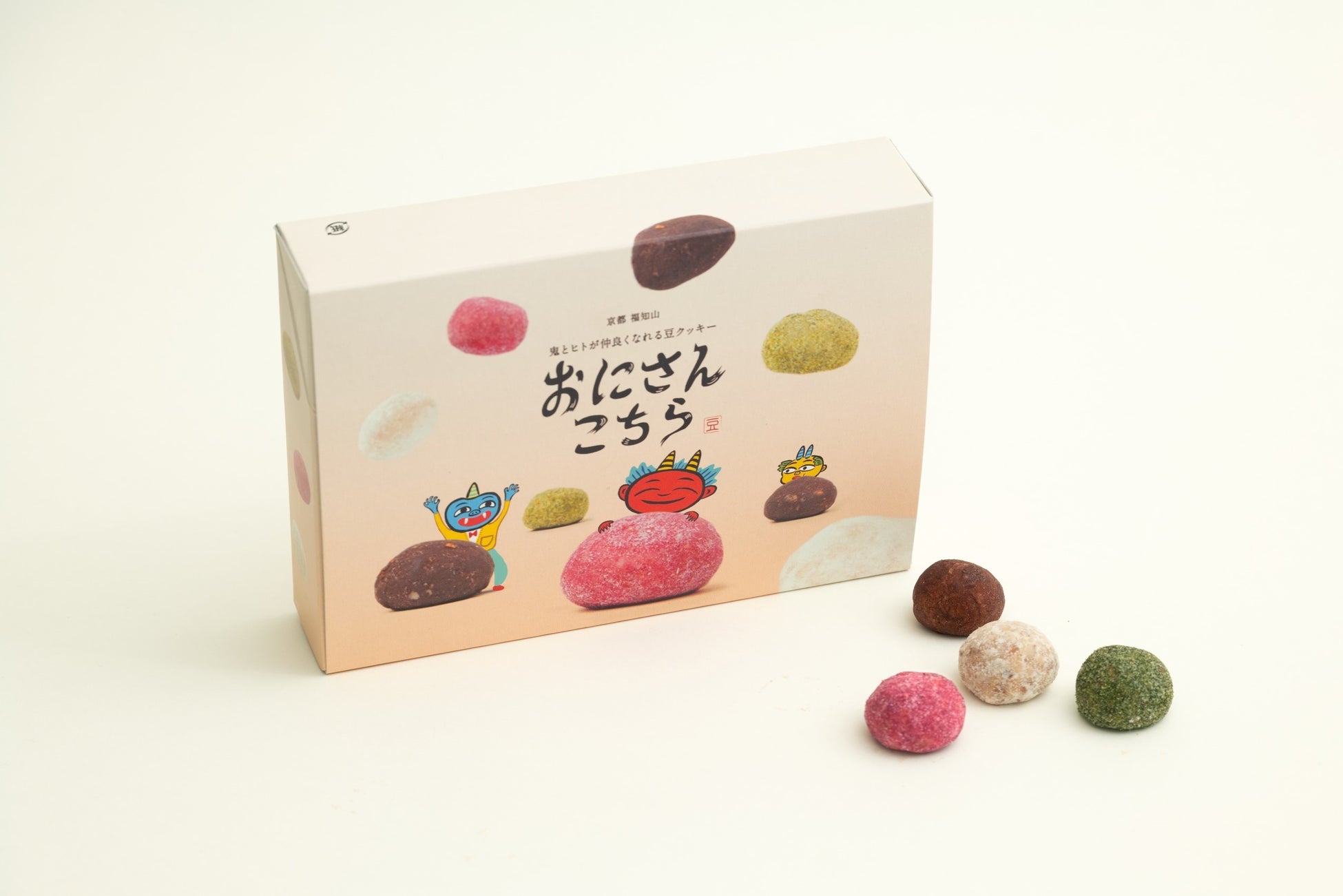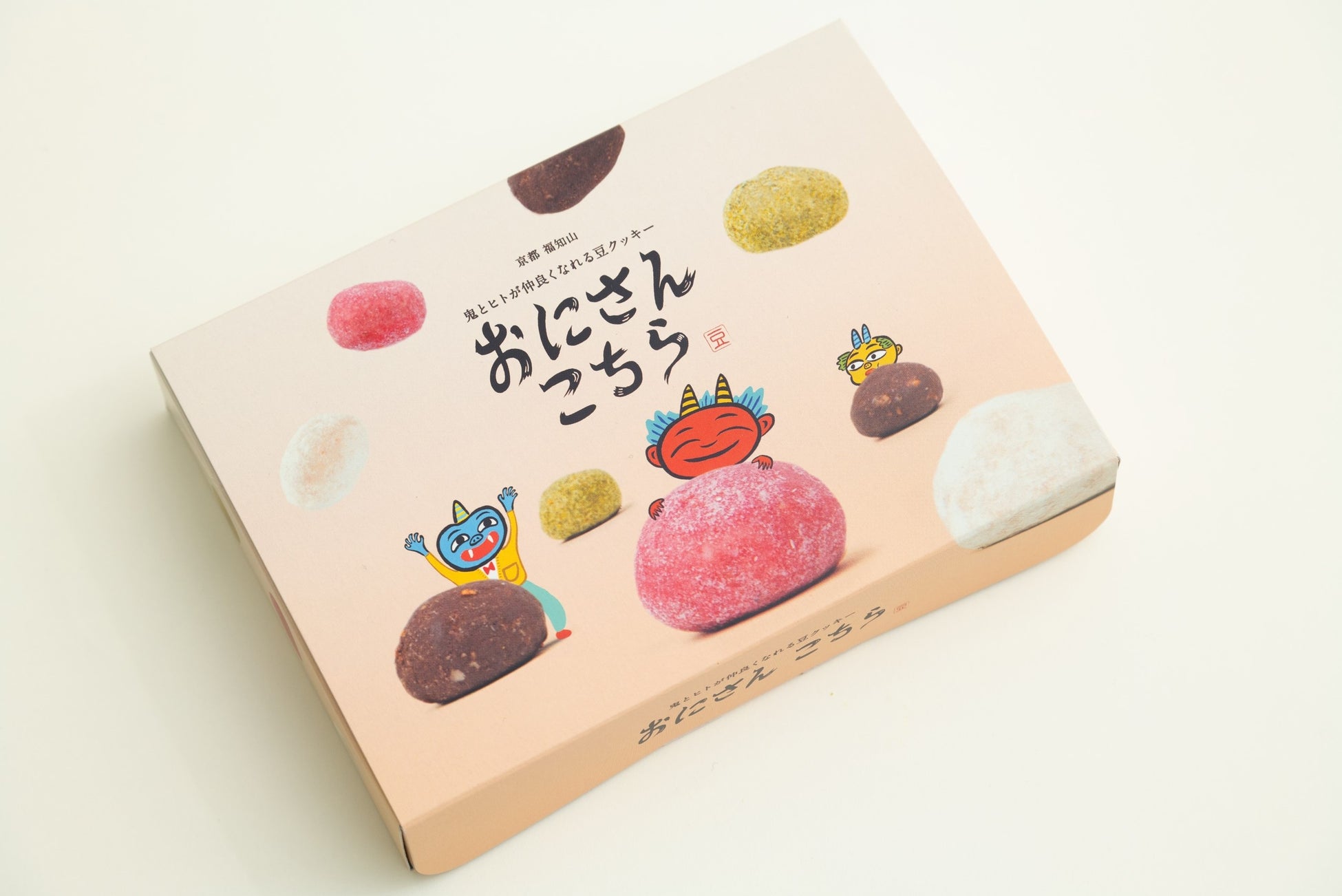 そんな“鬼のまち”福知山を広めるべく、地元や鬼にまつわる13団体・個人が集まり「鬼とヒトが仲良くなれる豆のお菓子」開発プロジェクトに取り組みました。約半年に渡る開発期間を経て、この度「投げずに、分け合おう。」をコンセプトとした新商品『おにさんこちら』が完成しました。クラッシュしたロースト大豆を練り込んだ、一口サイズのさくっほろっとした食感の豆クッキーで、鬼にまつわる団体・世界鬼学会も「鬼も喜んで食べてくれるような美味しい豆」(八木透会長談)とお墨付きです。