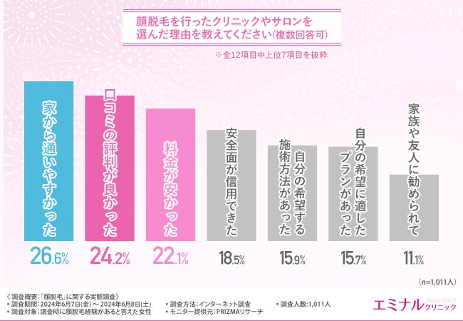 次に、「顔脱毛を行ったクリニックやサロンを選んだ理由を教えてください(複数回答可)」と質問したところ、『家から通いやすかった(26.6%)』と回答した方が最も多く、次いで『口コミの評判が良かった(24.2%)』『料金が安かった(22.1%)』と続きました。