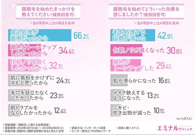 そこで今回、医療脱毛を手掛ける「エミナルクリニック」は、顔脱毛をしたことのある女性を対象に「顔脱毛」に関する実態調査を実施しました。