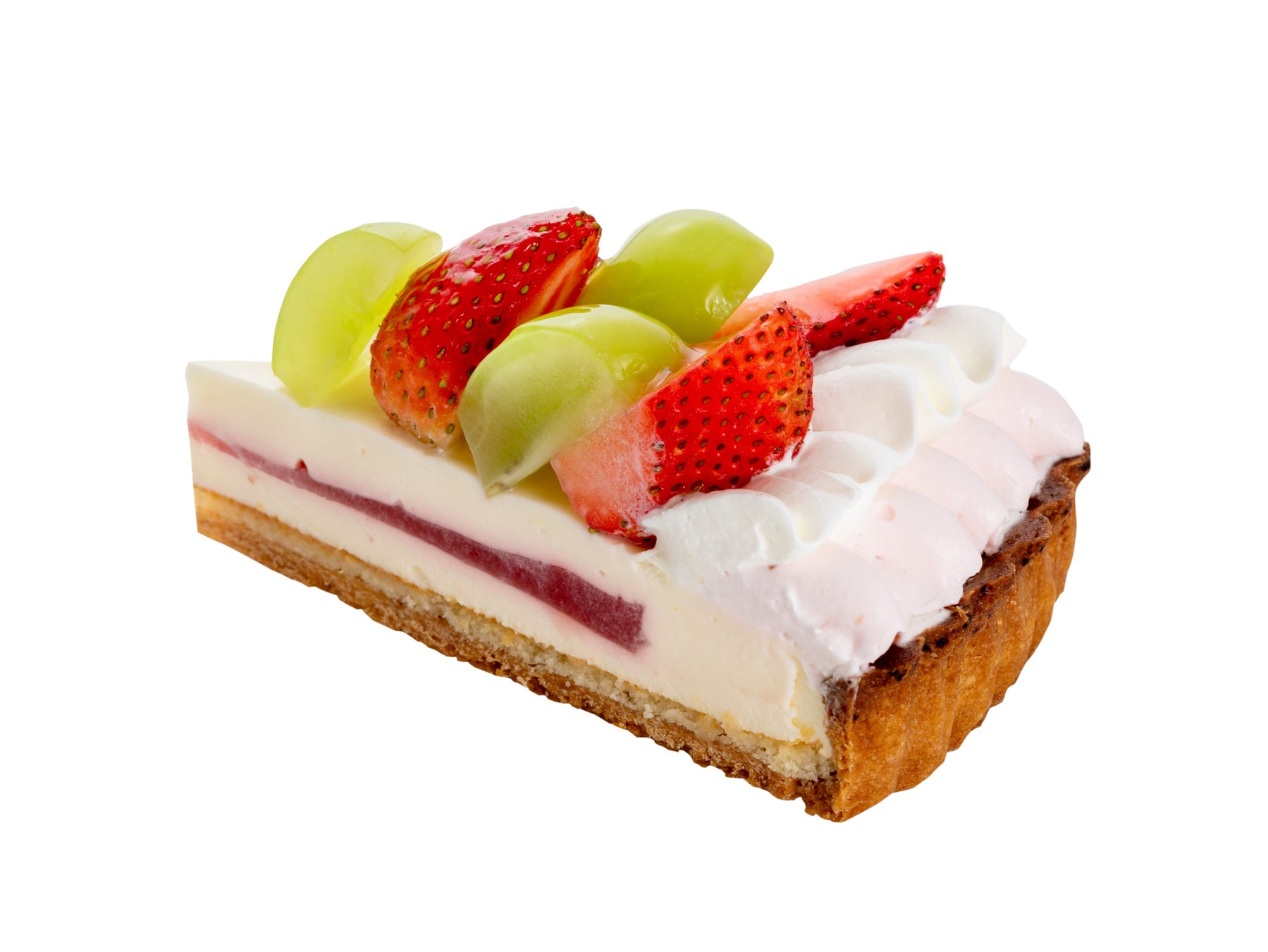 爽やかな甘みのシャインマスカットといちごを使用したレアチーズのタルトです。サクサクのクッキー生地とアーモンドクリームを焼きあげたタルト生地にレアチーズ、ストロベリージュレ、いちごクリーム、生クリームを合わせました。