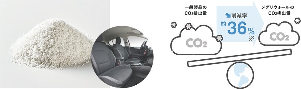 車両のクッション材に使用される樹脂の端材を壁紙の表面材として再利用。裏紙にもリサイクル材を使用しています。