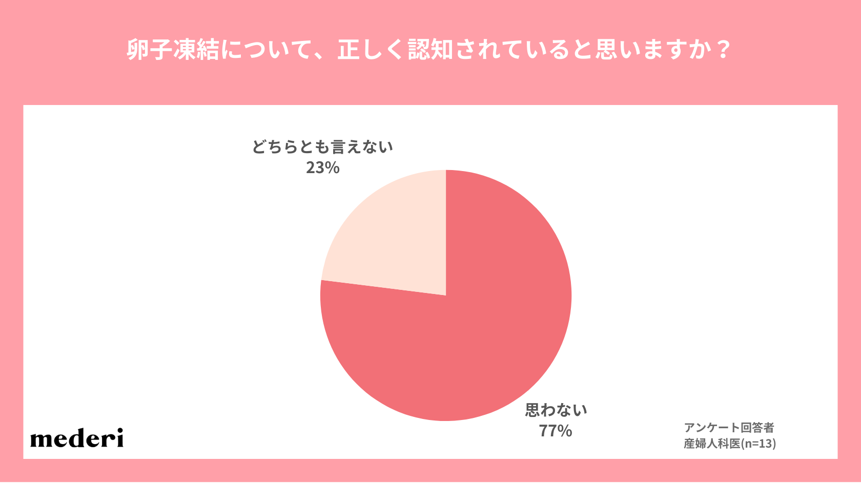 「卵子凍結について、正しく認知されていると思いますか?」という質問に対し、7割が「思わない」と回答し、「正しく認知されている」という回答はありませんでした。世の中の卵子凍結への一般的な認知と理解は不十分であり、専門医の視点からも懸念として感じられている状況が読み取れます。