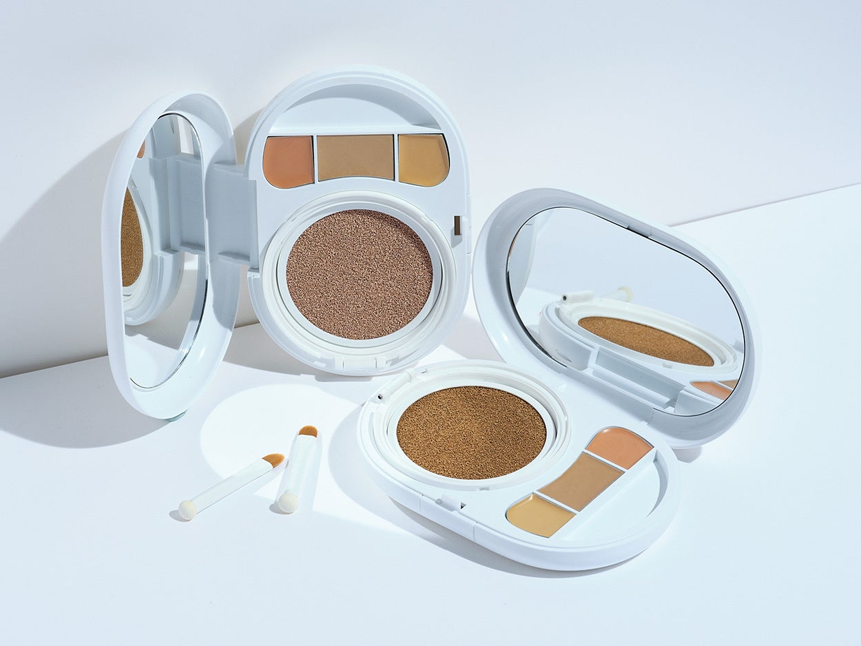 「effect like finish foundation kit」は、クッションファンデーションとコンシーラーがセットになった2in1のファンデーションキットです。クッションファンデーションは、セミマットなテクスチャーが素肌にしっかり密着し、高いカバー力でも厚塗り感なく仕上がります。また保湿力に優れた4種類のオイル成分を配合し、うるおいを保ちながら自然な仕上がりを24時間キープします。さらに、クマ、シミ、そばかす、ニキビ跡などの人によって異なる肌悩みも思い通りにカバーできるよう、カラーやテクスチャーをこだわり抜いた3色のコンシーラーがセットになっています。