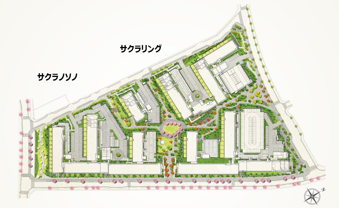 本物件は、長期優良住宅認定を取得予定で、耐震性・省エネ性・維持管理の容易さを備えた“安心して長く住み続けられる住まい”を目指しています。さらに、CASBEE(建築環境総合性能評価システム)Aランクを取得し、住棟でのZEH-M Oriented(ゼッチ・マンション・オリエンテッド)認証も取得予定です。環境性能に優れた住宅として、持続可能なまちづくりに貢献し、将来的な価値にも寄与する取り組みを行います。根川さくら通りに接する住棟からは春の桜並木を間近に楽しむことができ、季節の彩りを日常に取り込めます。敷地内には、春を象徴する「サクラノソノ」「サクラリング」(次項完成予想CG参照)をはじめ、イチョウゲート(秋)やフォレストプロムナード(夏)などを配置し、四季を通じて自然を感じられる街づくりを推進します。敷地の約1haを公園や遊歩道として整備し、地域に開かれた潤いある環境を形成します。
